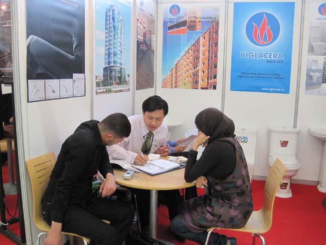 Ông Vũ Anh Tuấn - TP Xuất khẩu TCT Viglacera làm việc với các đối tác tại gian hàng Viglacera