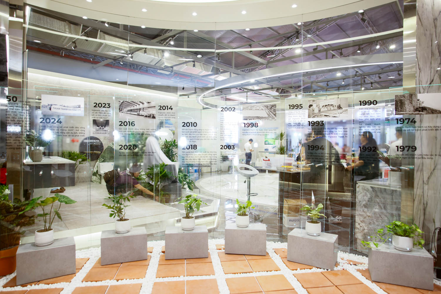 Điểm nhấn của triển lãm là hành trình lịch sử 50 năm được gói gọn trong không gian 180m². Trong đó, nổi bật nhất là hệ sinh thái vật liệu xây dựng xanh, bao gồm bê tông khí chưng áp, đá nung kết, kính tiết kiệm năng lượng và kính siêu trắng.