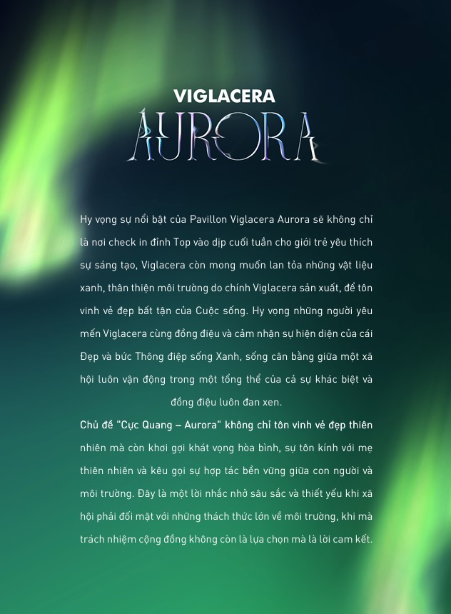 Trên tinh thần đó, công nghệ 3D mapping được sử dụng để tạo nên một không gian triển lãm nghệ thuật đa chiều, với những sắc màu lung linh chiếu trên những vật liệu xây dựng hiện đại, cùng mong muốn để mỗi người xem có thể tìm thấy trong đó cảm xúc của bản thân mình. Pavillon “Viglacera Aurora” được hai nghệ sĩ thị giác Nguyễn Duy Nhựt và Phạm Khiết Tường sáng tạo từ nền tảng 6 tác phẩm nghệ thuật tác động trực tiếp tới thị giác mang tên: Nguồn sống/ Thế giới Song song/ Chiến binh/ Mây Đa sắc/ Phố/ Đất….