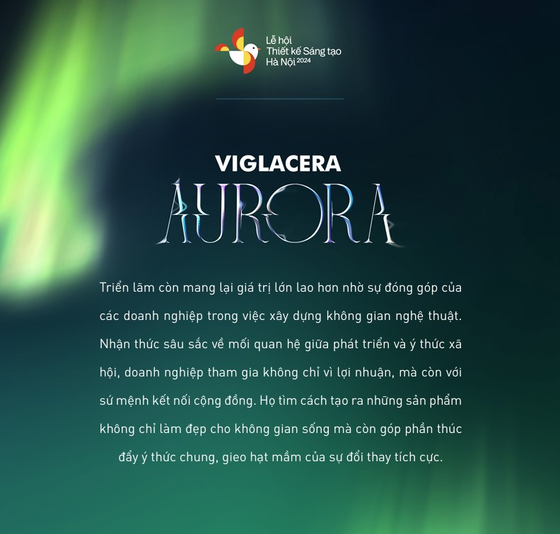 Tổng công ty Viglacera - CTCP tham gia tài trợ sự kiện và mang đến không gian Pavillon Viglacera Aurora độc đáo. Lấy ý tưởng từ Cực quang (Aurora), hiện tượng tự nhiên xuất hiện ở những vùng cực trên trái đất, khi các phân tử khí trong không khí tương tác với các hạt điện tử mặt trời. Viglacera tôn vinh Aurora để khích lệ lối sống bảo vệ nét đẹp tự nhiên, chân thực, bảo vệ những điều vốn có trong bản thể vũ trụ.