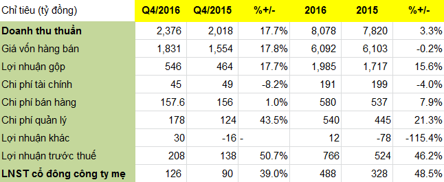 Doanh thu thuần trong quý IV/2016 đã tăng gần 18% so với cùng kỳ năm 2015, trong khi các chi phí khác không thay đổi đáng kể ngoài chi phí quản lý đã giúp VGC ghi nhận 126 tỷ đồng lợi nhuận sau thuế, tăng 39% so với cùng kỳ năm 2015.