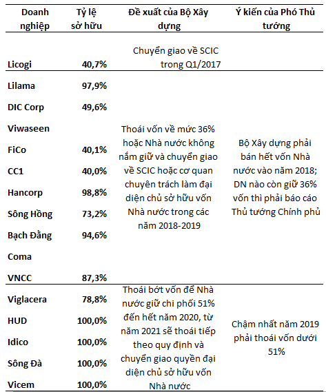 Theo đề xuất của Bộ Xây dựng, 5 tổng công ty lớn là Viglacera, HUD, Idico, Sông Đà và Vicem sẽ thoái bớt vốn nhưng vẫn để Nhà nước giữ chi phối 51% đến hết năm 2020, từ năm 2021 sẽ thoái tiếp theo quy định và chuyển giao quyền đại diện chủ sở hữu vốn Nhà nước.