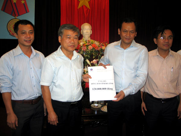 Tại đây, Đoàn đã trao tặng tổng số tiền 220 triệu đồng ủng hộ đồng bào vùng lũ cho đại diện UBND tỉnh Hà Tĩnh và UBND tỉnh Quảng Bình. Đây là số tiền quyên góp của CBCNV Tổng công ty nhằm chia sẻ những thiệt hại của bà con vùng lũ miền Trung, mong bà con sớm ổn định đời sống.