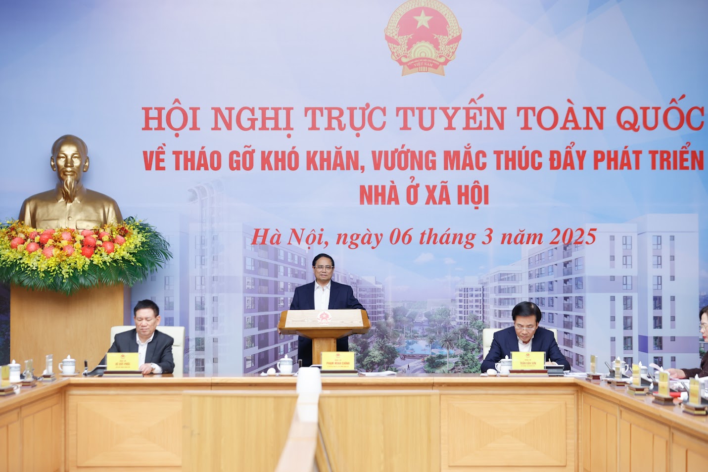 Phát biểu khai mạc, Thủ tướng Phạm Minh Chính cho biết việc phát triển nhà ở xã hội đã được bàn nhiều, nhưng công tác triển khai hiệu quả chưa cao. Chủ trương rất rõ của Đảng, Nhà nước ta là phát triển nhanh nhưng bền vững, không hy sinh tiến bộ, công bằng, an sinh xã hội để chạy theo tăng trưởng kinh tế đơn thuần; con người có quyền sống, quyền tự do, quyền mưu cầu hạnh phúc, trong đó gồm quyền có chỗ ở.
