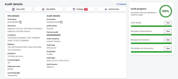 SMETA 4 (Sedex Members Ethical Trade Audit) là một trong những tiêu chuẩn kiểm toán tiên tiến nhất, bao gồm bốn trụ cột chính: Tiêu chuẩn lao động, Sức khỏe và An toàn, Đạo đức Kinh doanh, và Môi trường. Việc hoàn thành đánh giá này không chỉ chứng minh cam kết mạnh mẽ của Viglacera trong việc xây dựng một chuỗi cung ứng bền vững và có trách nhiệm, mà còn củng cố vị thế tiên phong của doanh nghiệp trong việc đáp ứng các yêu cầu quốc tế về trách nhiệm xã hội.