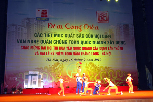 Lập thành tích chào mừng Đại hội Thi đua yêu nước ngành Xây dựng lần thứ III, Đại hội Thi đua yêu nước toàn quốc lần thứ VIII, chào mừng Đại lễ 1.000 năm Thăng Long - Hà Nội, trong hai ngày 14-15/9, Công đoàn ngành Xây dựng Việt Nam đã tổ chức Hội diễn văn nghệ quần chúng toàn quốc năm 2010. Tham dự có 18 đoàn với hơn 700 diễn viên là CNVCLĐ toàn ngành với các tiết mục dự thi đa dạng, phong phú, thể hiện bản sắc ngành Xây dựng Việt Nam.