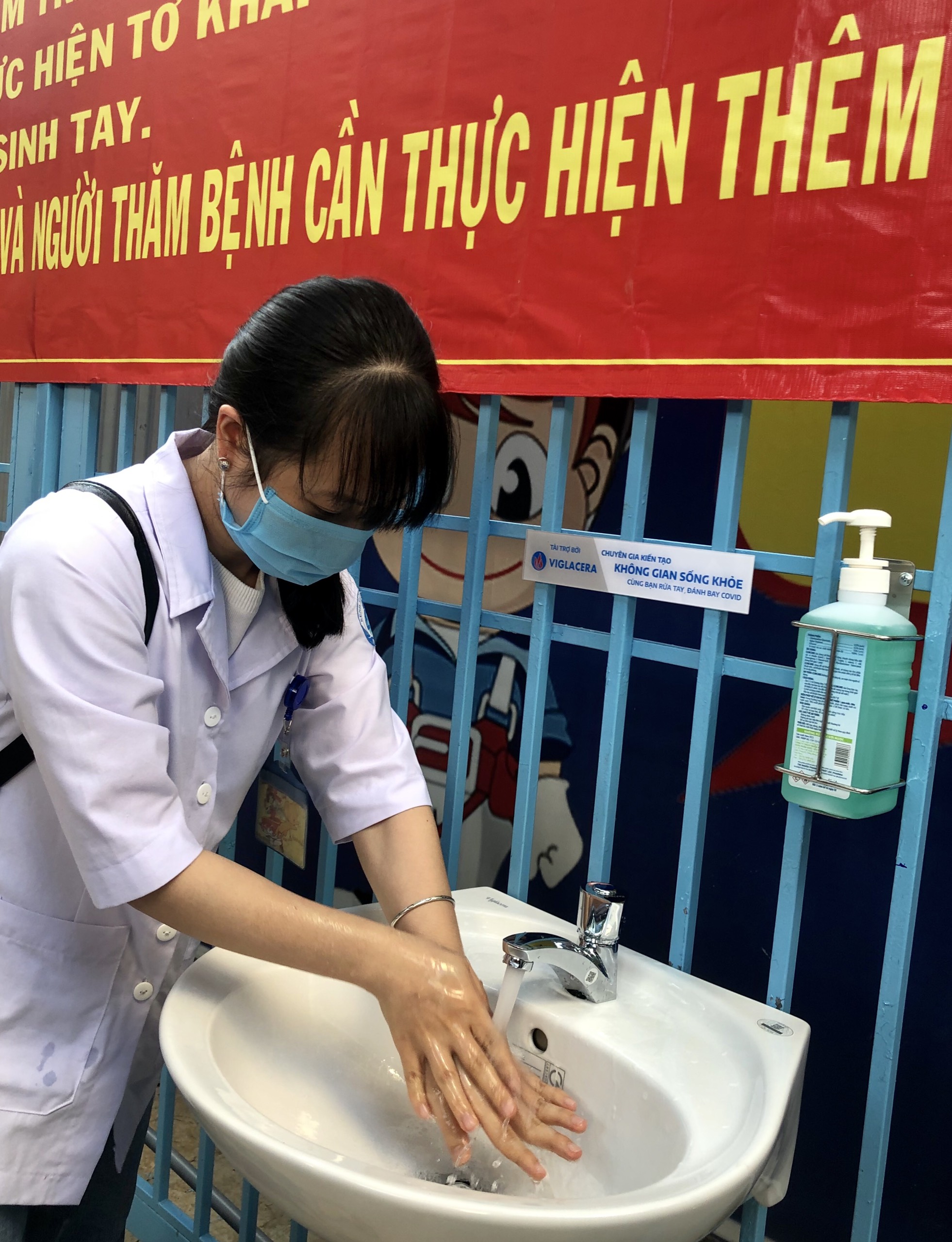 Chậu và vòi rửa Viglacera được lắp đặt tại điểm rửa tay công cộng trong Bệnh viện Nhi Đồng 1 (Tp. HCM)