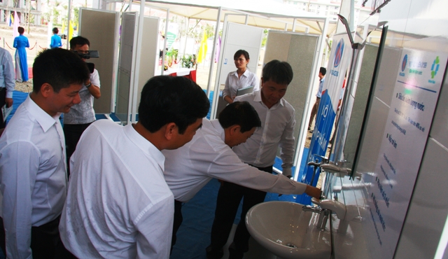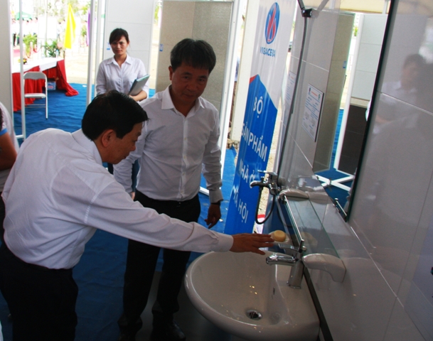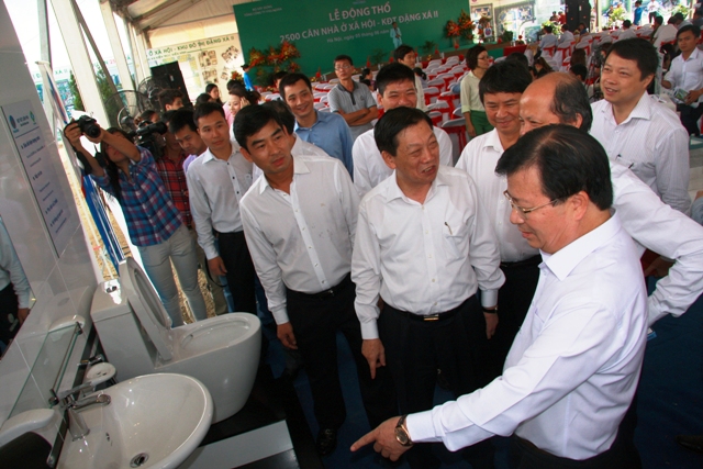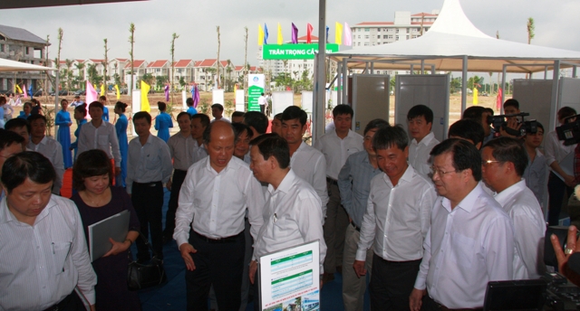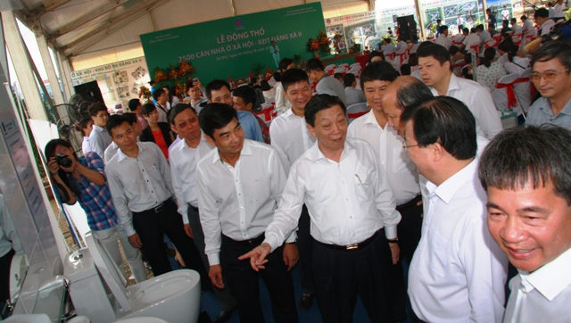 Bộ trưởng BXD Trịnh Đình Dũng và Chủ tịch UBND Thành phố Hà Nội Nguyễn Thế Thảo cùng BLĐ TCT Viglacera tham quan khu trưng bày các bộ sản phẩm sử dụng cho NOXH KĐT Đặng Xá 2