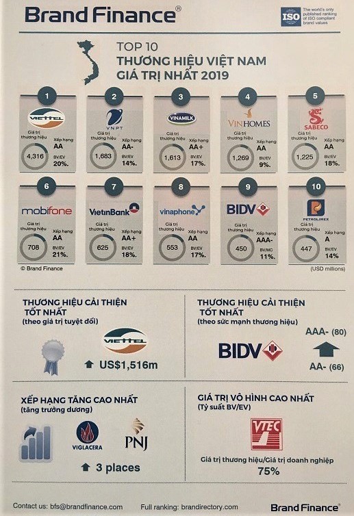 Top 50 doanh nghiệp thương hiệu giá trị nhất Việt Nam được Brand Finance chứng nhận chính thức về thứ hạng, giá trị thương hiệu quốc gia và chỉ số sức khỏe thương hiệu tại thị trường Việt Nam.Brand Finance tính toán giá trị các thương hiệu trong bảng xếp hạng bằng việc sử dụng "Phương pháp Chiết khấu Phí bản quyền" - ước tính doanh số tương lai được tạo ra từ thương hiệu và tính toán tỷ lệ phí bản quyền trả cho việc sử dụng thương hiệu, tức là công ty muốn sử dụng thương hiệu phải trả cho việc sử dụng thương hiệu - với giả định rằng thương hiệu không thuộc sở hữu của công ty đó.Điều này khẳng định sự phát triển và sức mạnh thương hiệu của các Doanh nghiệp Việt Nam trong năm 2019. |