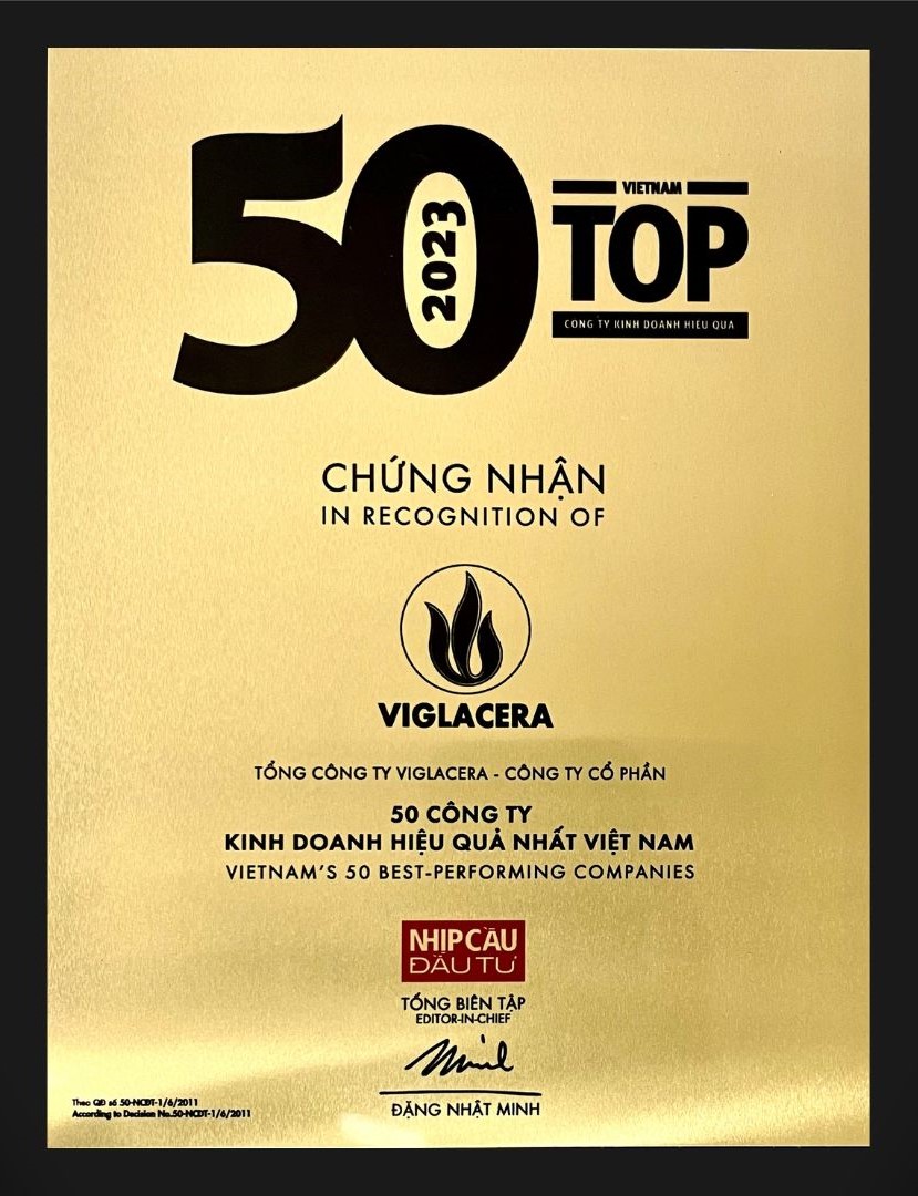 Chứng nhận “Top 50 Công ty kinh doanh hiệu quả nhất Việt Nam” 2023 của Viglacera
