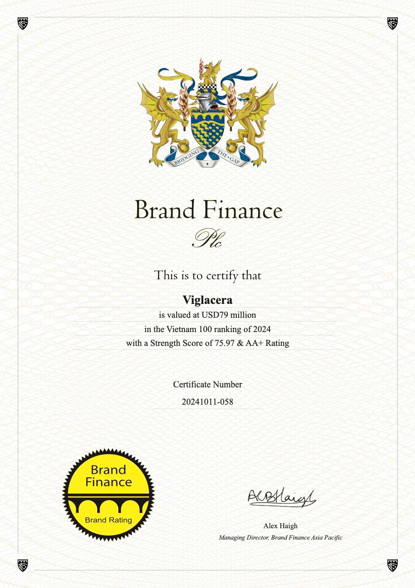 Trong bảng xếp hạng TOP 100 thương hiệu giá trị nhất Việt Nam, Viglacera đạt được xếp hạng AA+ cho thấy thương hiệu có nền tảng vững chắc, được người tiêu dùng và thị trường đánh giá cao, cũng như có tiềm năng phát triển bền vững, lâu dài