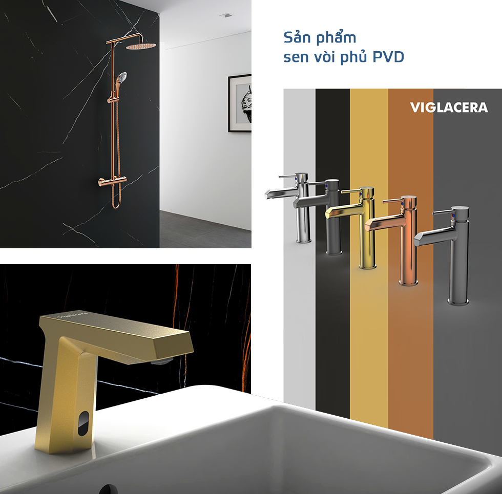 Màu sắc đa dạng và sang trọng của lớp mạ PVD còn mở ra các sáng tạo kiến trúc tổng thể, kết nối với các thiết bị nội thất và vệ sinh khác trong phòng tắm, phòng bếp…, đáp ứng mọi phong cách thiết kế từ cổ điển cho đến hiện đại.