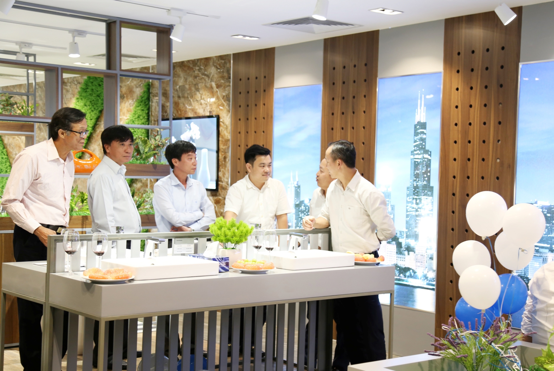 Tại Showroom này, lần đầu tiên Viglacera ra mắt bộ sản phẩm gương tủ chậu tích hợp các tính năng điện tử smart. Mẫu tủ chậu có thiết kế mới nhất, hiện đại nhất trên thị trường, phù hợp, đồng bộ với kiểu dáng của chậu rửa đến vòi chậu. Sử dụng chậu đồng bộ với tủ chậu và gương điện không chỉ mang tới sự gọn gàng, ngăn nắp mà còn tạo điểm nhấn cho không gian phòng tắm tiện nghi, sang trọng.