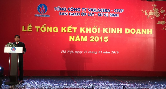 Mở đầu buổi lễ, Ông Nguyễn Văn Lý - Chủ tịch HĐQT Công ty CP KD gạch ốp lát Viglacera, Giám đốc Công ty CPTM Viglacera có lời phát biểu tóm lược các kết quả thực hiện năm 2015, kế hoạch và định hướng năm 2016 của Ban gạch ốp lát - sứ vệ sinh. Trong năm 2015, Tổng công ty Viglacera và Ban gạch ốp lát-sứ vệ sinh đã đạt được rất nhiều thành tích trong công tác sản xuất kinh doanh của mình. Các đơn vị trong Ban đã hoàn thành tất cả các chỉ tiêu Tổng công ty giao: Chỉ tiêu lợi nhuận năm 2015 của cả Ban đạt 102% kế hoạch, tăng 109% so với cùng kỳ năm 2014. Chỉ tiêu doanh thu đạt 108,4% so với kế hoạch năm 2015, tăng 12,7% so với thực hiện năm 2014. Chỉ tiêu giá trị sản xuất kinh doanh đạt 109,3% kế hoạch, tăng 15% so với cùng kỳ năm 2014. Đặc biệt, trong công tác thị trường đã đưa diện mạo mới, hình ảnh mới của sản phẩm Viglacera trên thị trường trong và ngoài nước. Bước sang năm 2016 là năm bản lề của kế hoạch 5 năm 2016-2015, Công ty CP Thương mại Viglacera và Công ty CP Kd gạch ốp lát Viglacera phấn đấu hoàn thành các chỉ tiêu mà Tổng công ty giao, hoàn thành các chỉ tiêu cam kết với các đơn vị sản xuất đồng thời thực hiện các giải pháp về thị trường, tạo điều kiện thuận lợi về chính sách bán hàng, về sản phẩm, về dịch vụ để hoàn thành nhiệm vụ năm 2016.