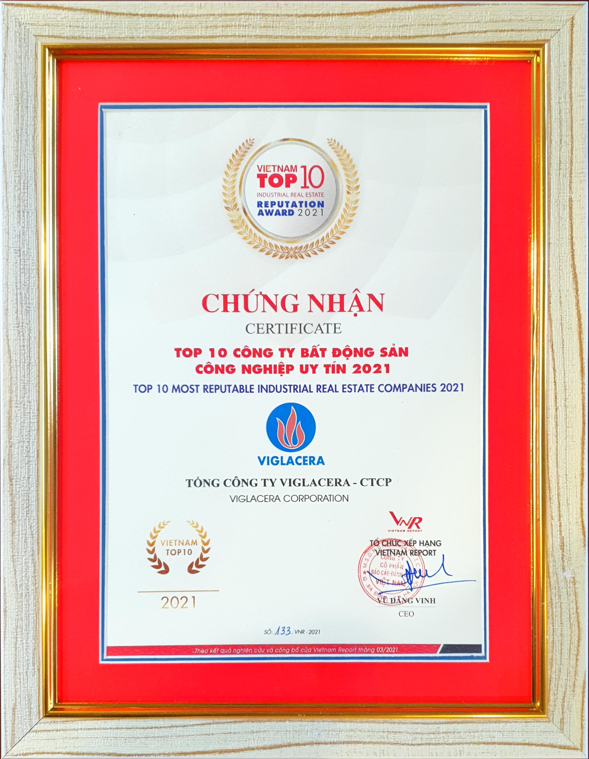 Tối 27/4/2021, Tổng công ty Viglacera – CTCP đã vinh dự nhận giải thưởng “Top 10 Công ty Công ty Bất động sản Công nghiệp uy tín năm 2021” - kết quả dựa trên nghiên cứu và đánh giá độc lập của Công ty cổ phần Báo cáo đánh giá Việt Nam (Vietnam Report).