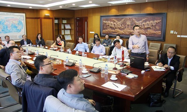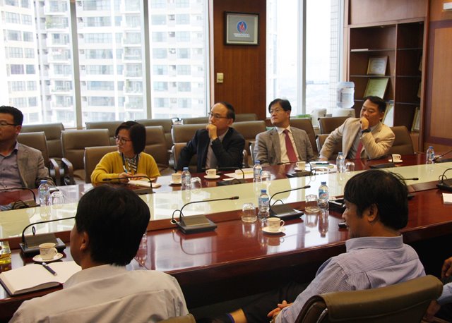 Tổng giám đốc Tổ hợp Samsung Việt Nam - ông Han Myoung Sup (vest đen, thứ 3 từ phải sang) trực tiếp trao đổi với Ban Lãnh đạo TCT Viglacera về việc đầu tư xây dựng nhà ở công nhân
