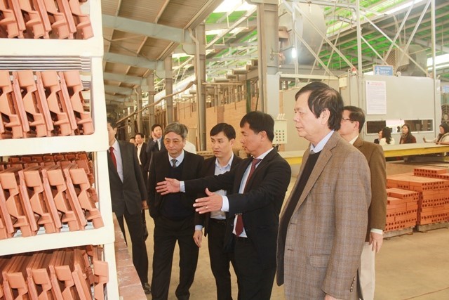 Tổng giám đốc TCT Viglacera - CTCP Nguyễn Anh Tuấn cùng các đồng chí Nguyên lãnh đạo TCT kiểm tra sản phẩm của dự án chuyển đổi nung đốt 100% ngói tại Nhà máy Gạch Hoành Bồ