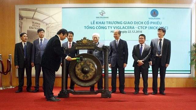 Ngày 22/12/2016, Viglacera đã chính thức niêm yết cổ phiếu trên Sàn giao dịch Chứng khoán Hà Nội – HNX với mã chứng khoán VGC và có giá trị vốn hóa là 4912 tỷ đồng, tăng 75% so với khi bắt đầu giao dịch tại Upcom. Tổng khối lượng cổ phiếu niêm yết là hơn 65 triệu cổ phiếu tương ứng giá trị tính theo mệnh giá là trên 650 tỷ đồng. Giá tham chiếu phiên chào sàn là 15.600 đồng/cổ phiếu.