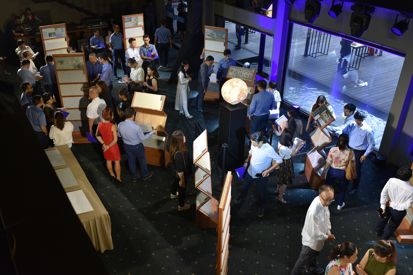 Khách hàng thăm quan và trải nghiệm bộ sản phẩm “Eurotile – Ngày gặp lại” của Viglacera. Không gian trưng bày sản phẩm được sắp xếp thành các lớp, lấy ý tưởng từ sự phát triển của thế giới tự nhiên và con người