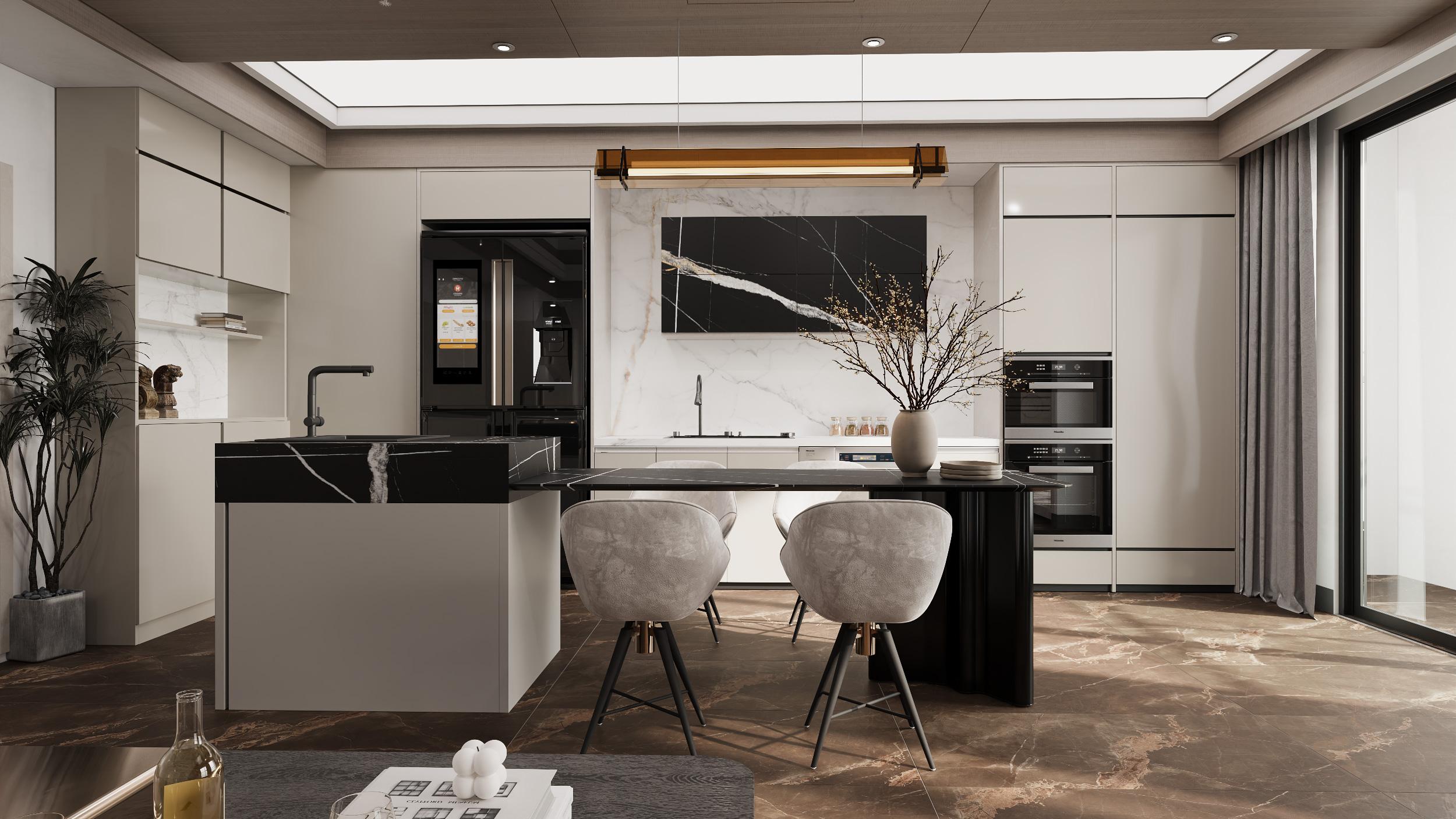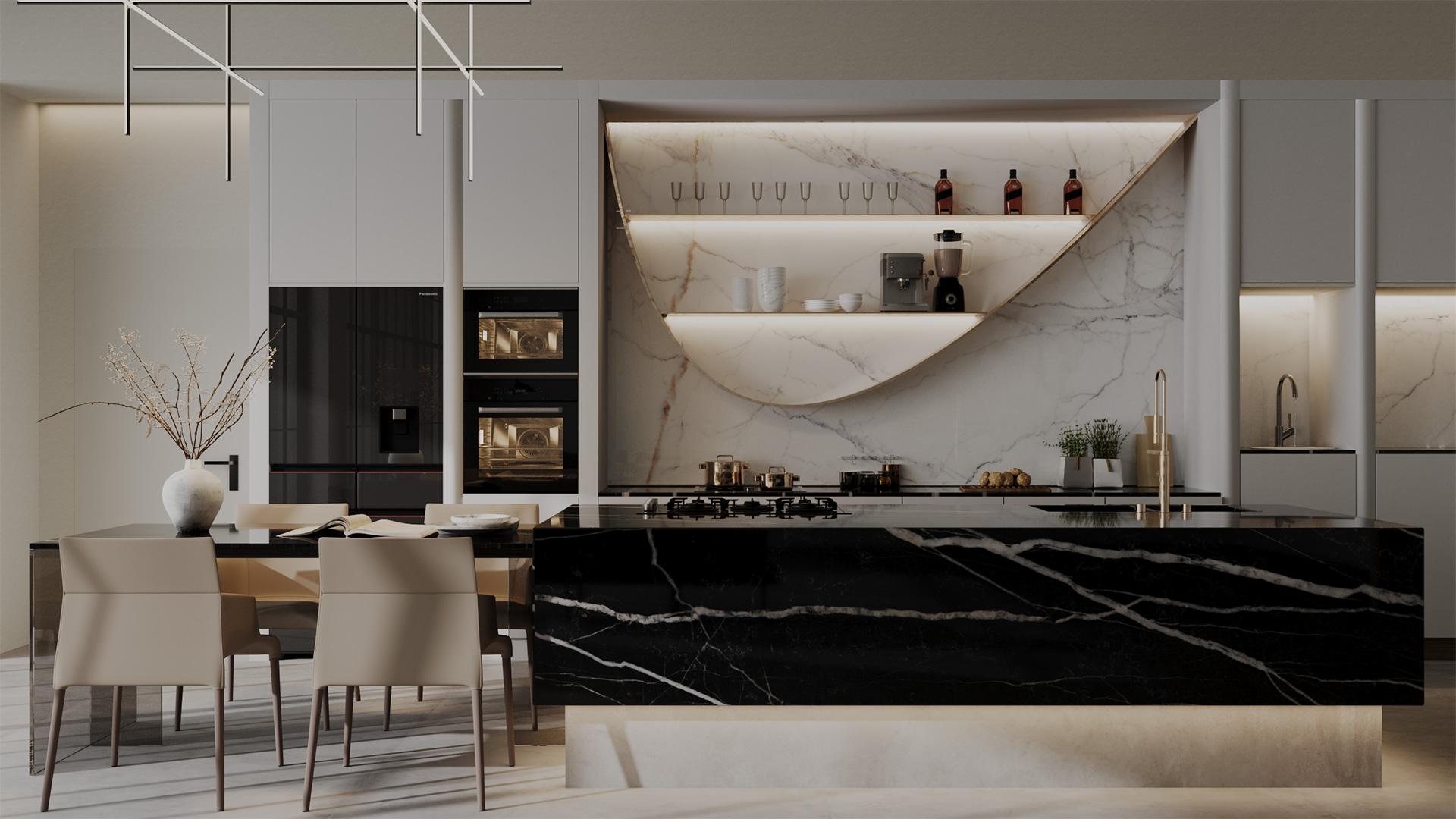 Trong phòng bếp, đảo bếp với bề mặt liền khối, cạnh đá liền vân mang lại cảm giác gọn gàng, hiện đại và tiện nghi.