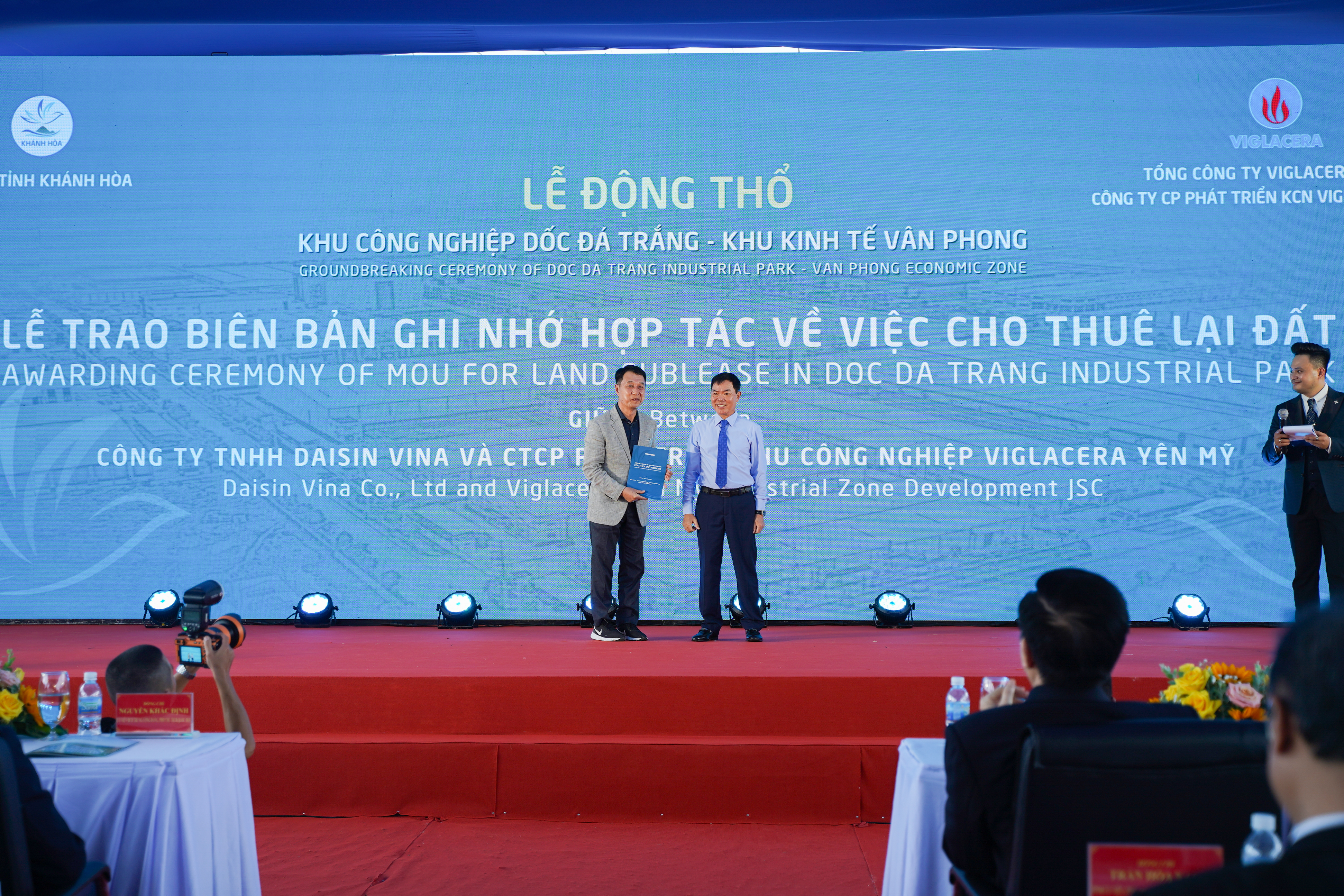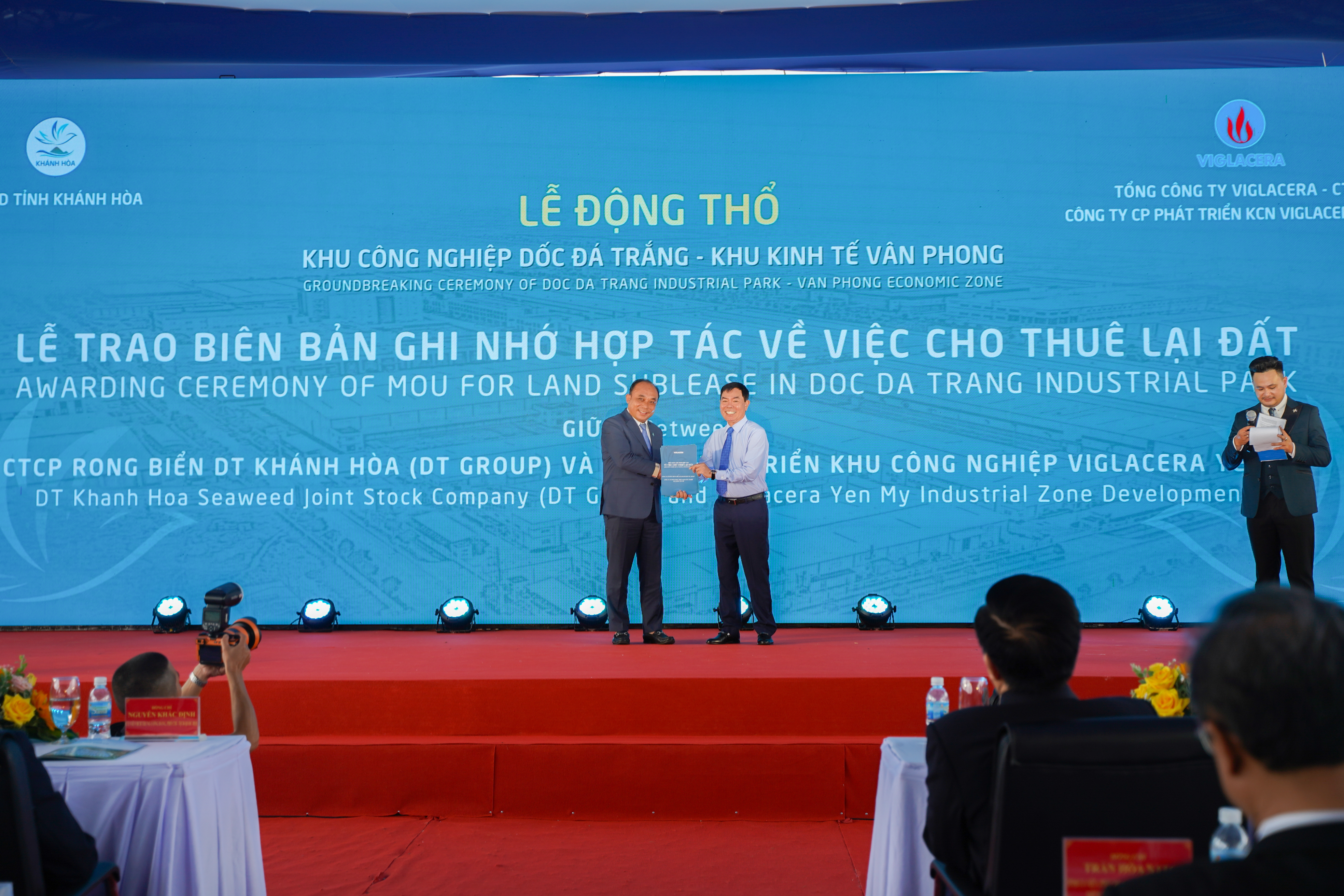 Mr. Nguyen Quang Duy - Chairman of the Board of Directors of DT Khanh Hoa Seaweed Joint Stock Company (DT Group) and Viglacera Yen My Development Joint Stock Company presented the Memorandum of Understanding on cooperation. DT Khanh Hoa Seaweed Joint Stock Company (DT Group) was established on August 7, 2010 in Khanh Hoa, is one of the first enterprises to research and successfully cultivate Japanese Sea Grapes in the natural environment in Khanh Hoa, meeting HACCP standards and FDA certification. At Doc Da Trang Industrial Park, DT Group is researching to invest in a new project, with a total investment of 15 million USD on an area of ​​3 hectares.