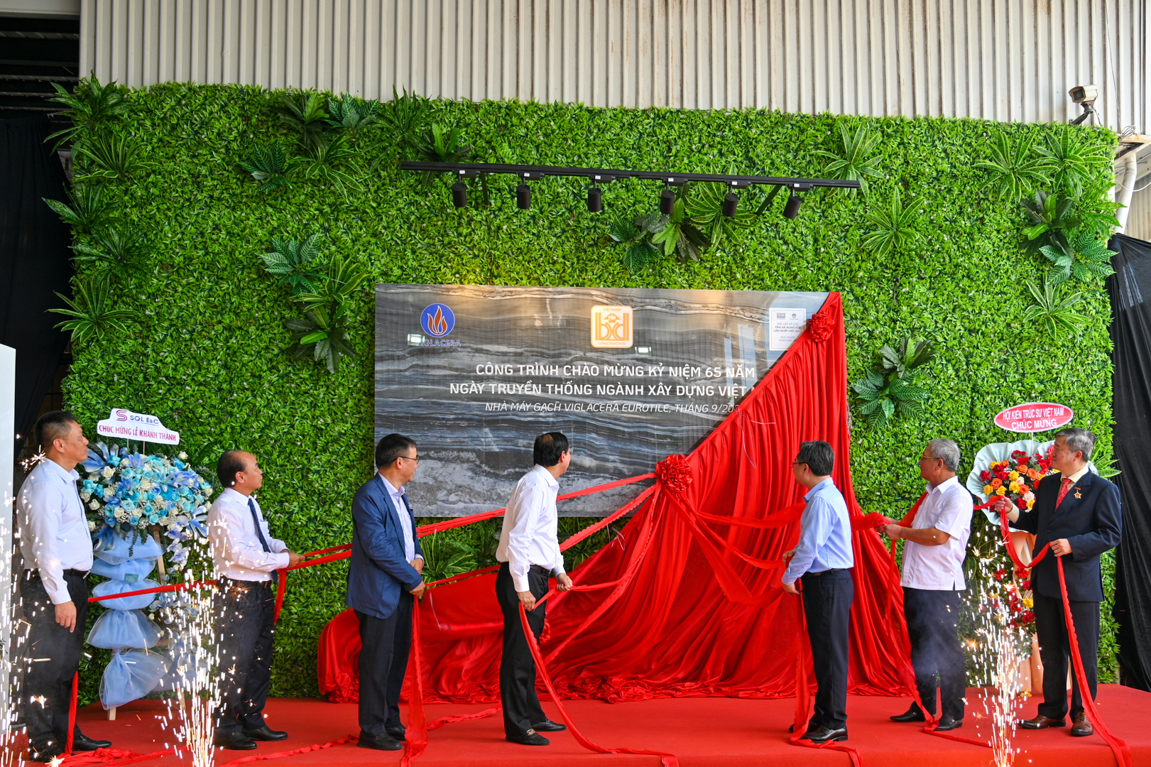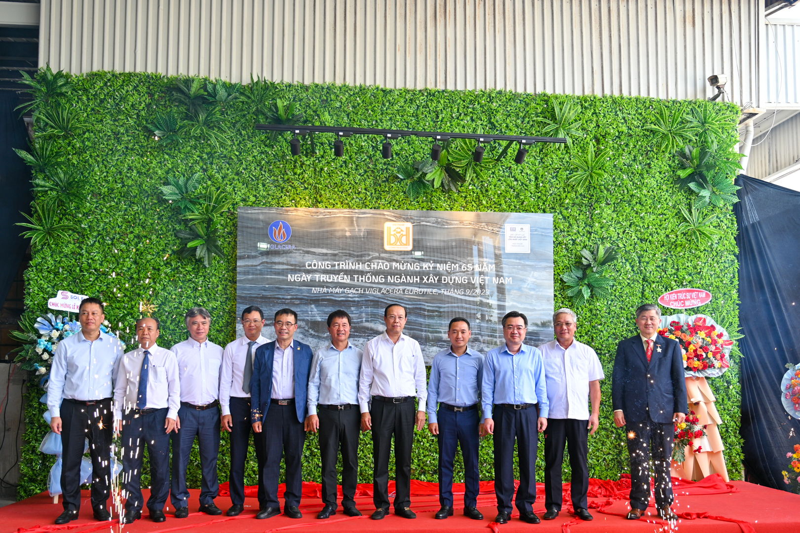 On the same day, the ceremony to install a construction project sign in celebration of the 65th anniversary of Vietnam's construction industry was solemnly placed on the largest sintered stone slab in Vietnam. The ceremony to install the construction project sign commemorating the 65th anniversary of the Construction industry holds significant meaning, showcasing the dedication and pride of generations of leaders, officials, workers, civil servants, and laborers in the construction sector as a whole, and specifically of Viglacera Corporation.