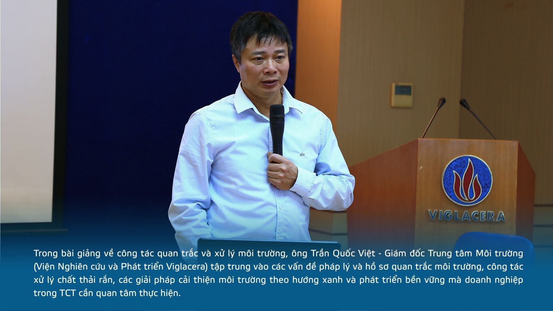 The training course includes 8 key topics, focusing on updating knowledge, improving management skills and law enforcement in the fields of environment and fire prevention and fighting. Some typical contents include: Topic 1: Environmental monitoring and treatment at Viglacera; Topic 2: Current legal regulations related to environmental crimes; Topic 3: Overview of the system of legal documents on environmental protection, emphasizing new points in the Law on Environmental Protection and Decrees guiding implementation related to environmental criteria, strategic environmental assessment (SEA), preliminary and detailed environmental impact assessment (EIA). Topic 4: Environmental licenses, environmental registration. Regulations on waste management guidelines in enterprises. Topic 5: Vietnam eco-label for construction material products. Topic 6: Investigation skills, collection, processing and management of data information in environmental monitoring activities. Topic 7: Legal knowledge, knowledge of fire prevention and fighting suitable for the Corporation. Topic 8: Fire prevention and fighting and rescue skills.