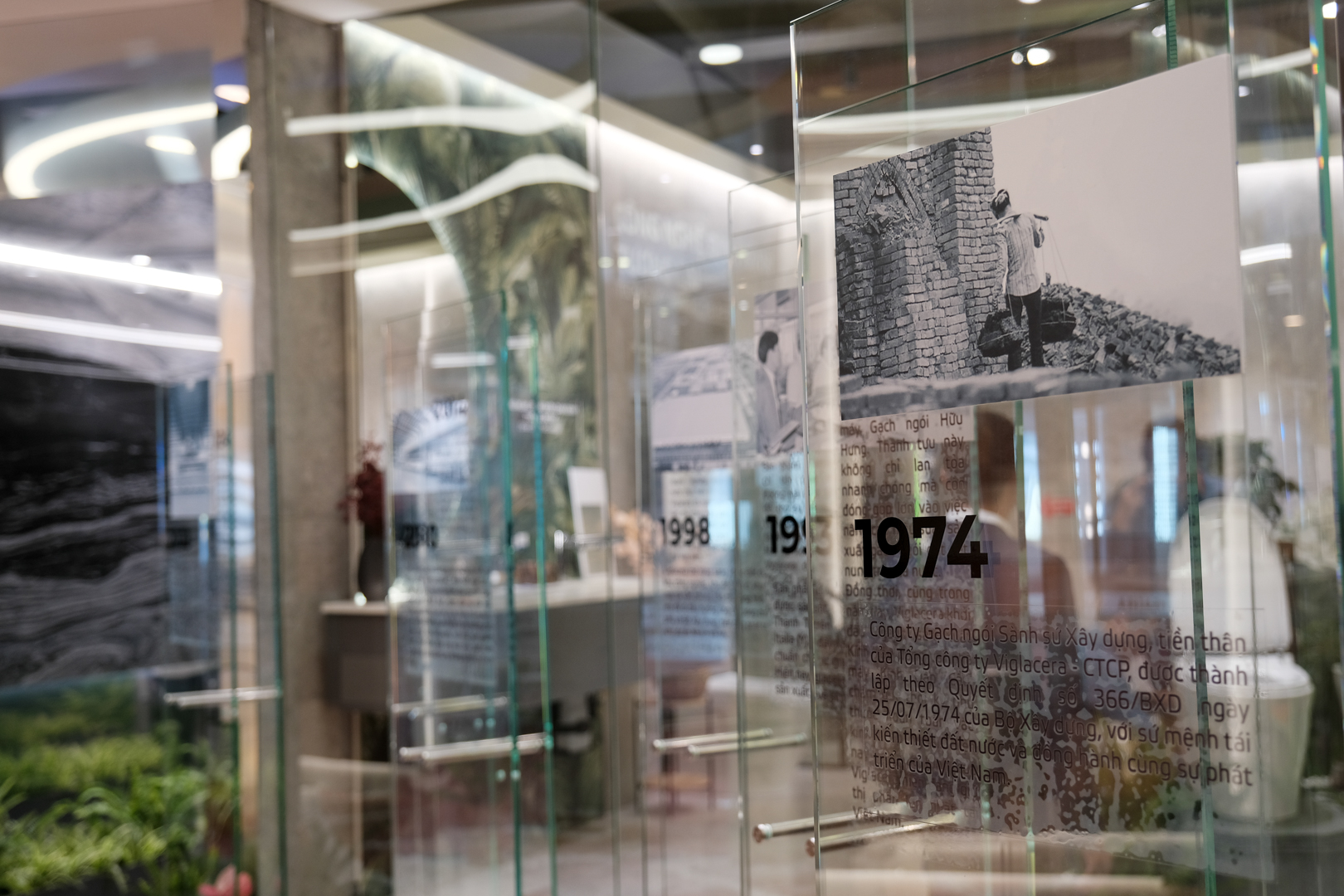 Space of origin of the 50-year journey: The historical area in Viglacera's exhibition is an important part of the exhibition space. The stages of Appearance - Development - Flourishing of all technological revolutions at Viglacera are clearly presented. However, the traditional and modern atmosphere is designed and integrated, cleverly interwoven. This area is a unique "check-in" point, where every step of the visitor becomes a moment to keep memories and prove their presence at this meaningful exhibition.