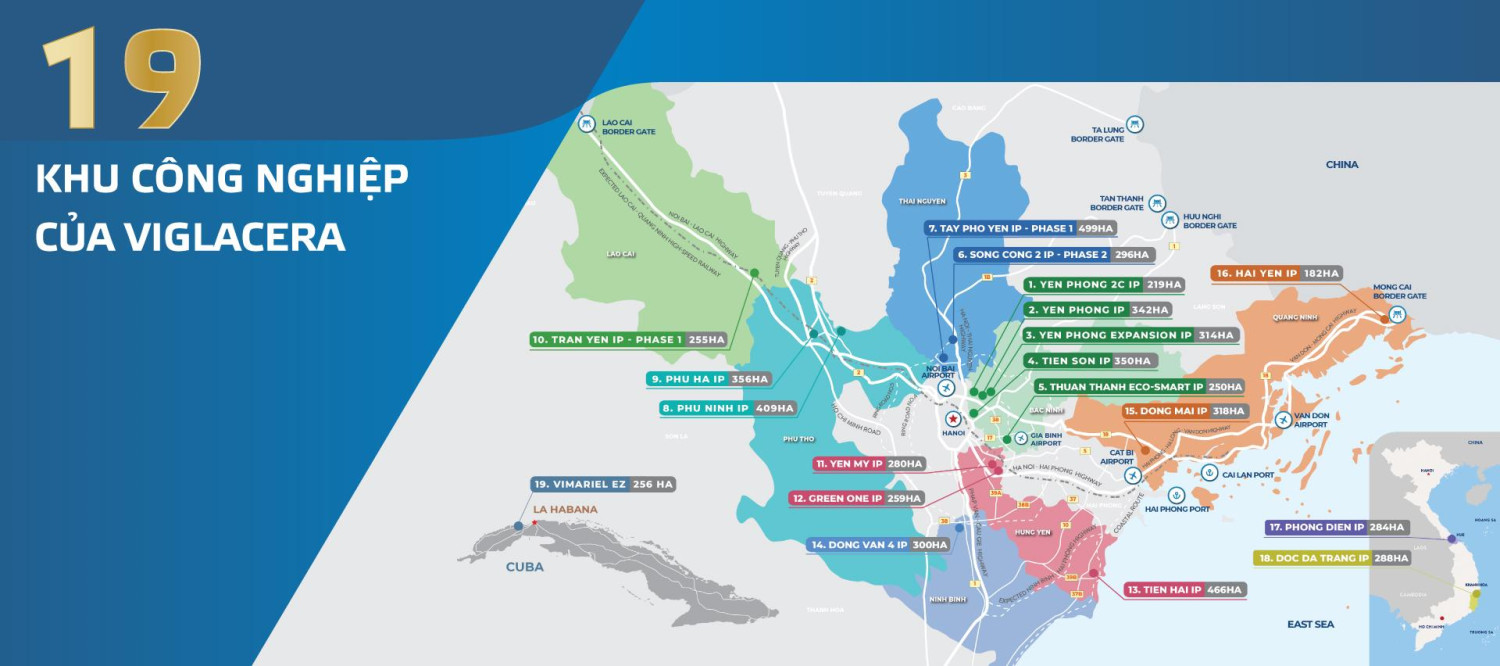 Viglacera hiện sở hữu 31 nhà máy công nghiệp sản xuất các vật liệu xây dựng cơ bản cho Ngành Xây dựng Việt Nam như: kính xây dựng, kính công nghệ cao, gạch ốp lát, đá nung kết, thiết bị vệ sinh, bê tông khí chưng áp, gạch ngói đất sét nung. Viglacera cũng là chủ đầu tư 16 khu công nghiệp trong và ngoài nước với tổng quỹ đất hơn 4.500ha, thu hút tới gần 20 tỷ USD vốn đầu tư nước ngoài; 18 khu đô thị nhà ở và 1 khách sạn nghỉ dưỡng 5 sao.