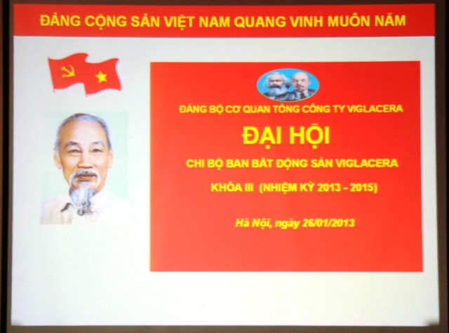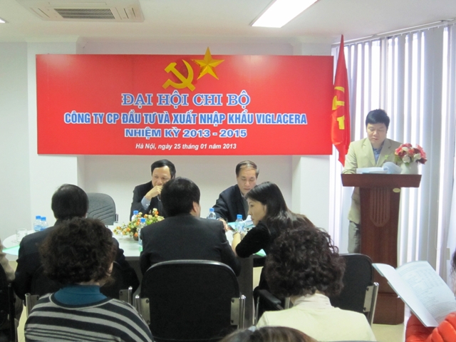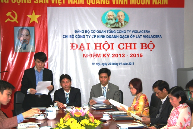 Thực hiện Điều lệ Đảng Cộng Sản Việt Nam, ngày 25- 26/01/2013 tại trụ sở TCT Viglacera, Chi bộ Cty Kinh doanh XNK; Cty CP Đầu tư hạ tầng và Đô thị; Chi bộ Cty CP Kinh doanh Gạch ốp lát; Chị bộ Cty CP Tư Vấn; Chi bộ Ban bất động sản Viglacera đã tổ chức Đại hội Chi bộ nhiệm kỳ 2012 – 2015. Tham dự Đại hội tại các Chi bộ có đồng chí Nguyễn Quý Tuấn – Thường trực Đảng Ủy cùng các đồng chí Nguyễn Anh Tuấn, Nguyễn Minh Tuấn, Đào Đình Thi, Nguyễn Thế Vinh, Nguyễn Thế Chinh, Trần Thị Minh Loan UV BCH Đảng bộ TCT Viglacera đã phân công cùng tham dự và chỉ đạo các Đại hội.