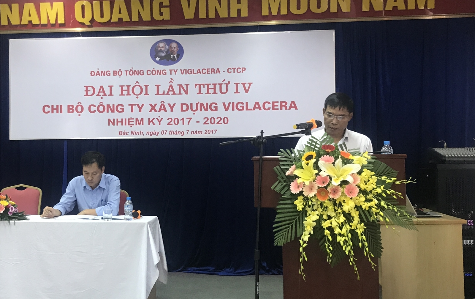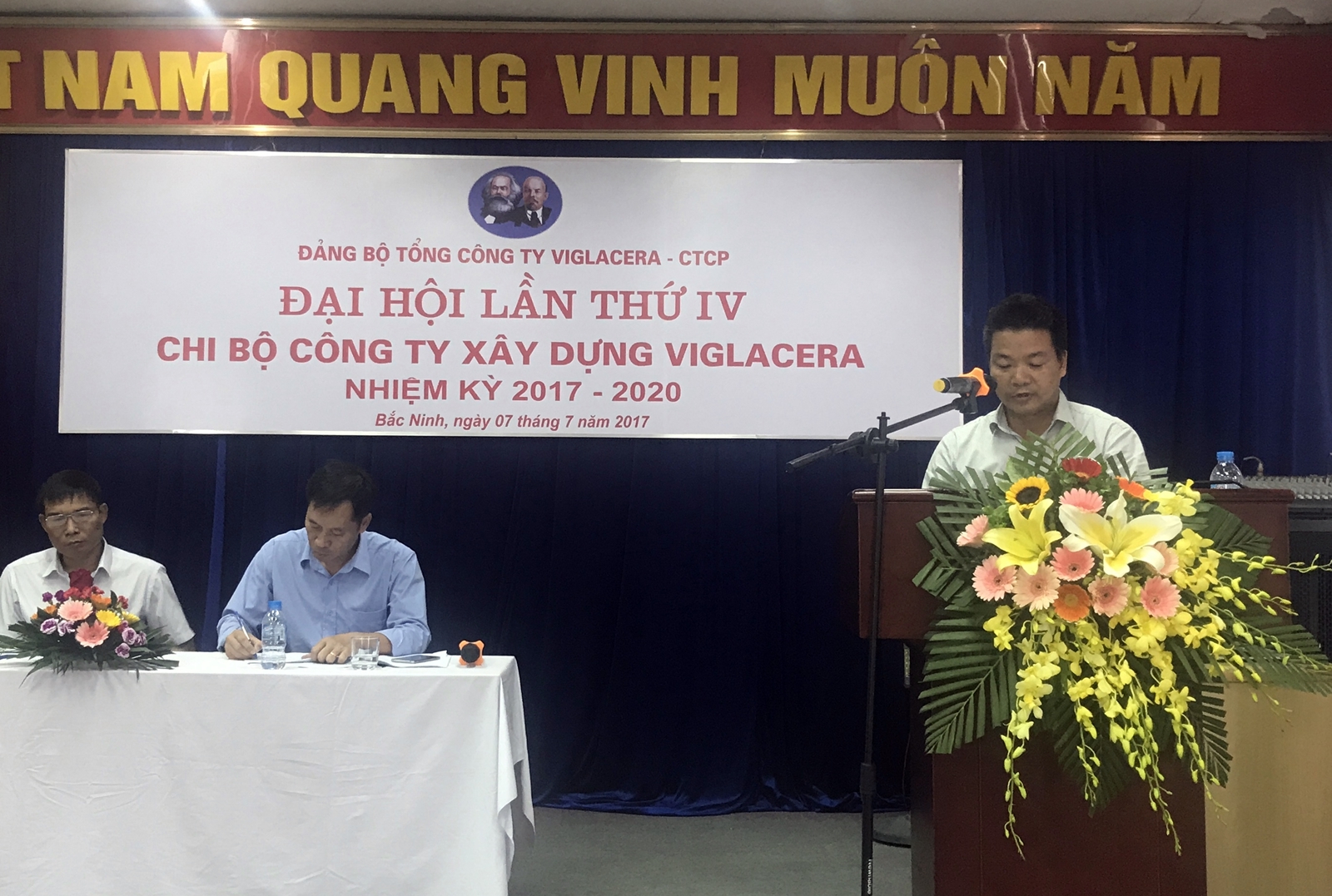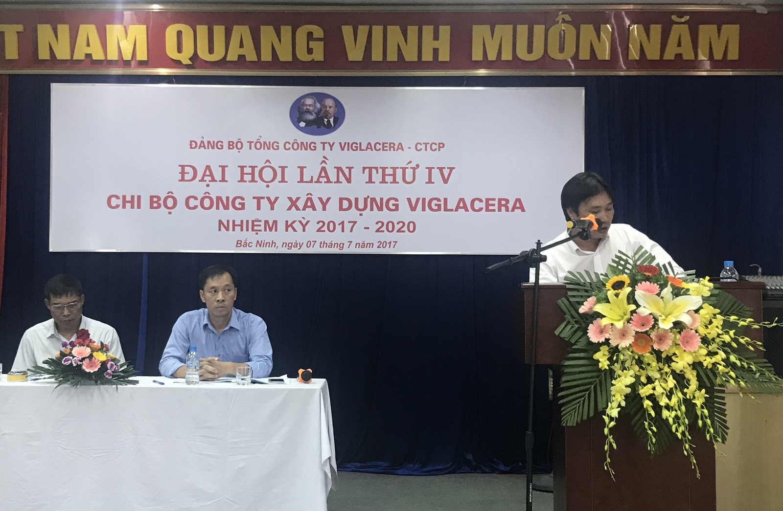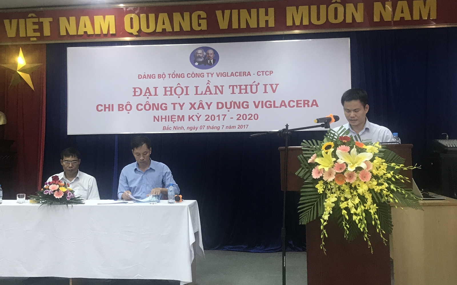 Thực hiện văn bản số 352 - KH/ĐU ngày 5/6/2017 của Đảng uỷ Tổng Công ty Viglacera - CTCP về Kế hoạch Tổ chức Đại hội các Chi bộ trực thuộc Đảng bộ Tổng công ty Viglacera - CTCP nhiệm kỳ 2017 – 2020; Sáng ngày 07 tháng 7 năm 2017, Chi bộ đảng Công ty Xây dựng Viglacera tổ chức Đại hội khóa IV nhiệm kỳ 2017 – 2020. Về dự và chỉ đạo Đại hội có Đồng chí Nguyễn Quý Tuấn, Ủy viên thường vụ đảng bộ Tổng công ty, Chủ tịch Công đoàn Tổng công ty; Đồng chí Nguyễn Thế Chinh, Ủy viên BCH đảng bộ Tổng công ty, Giám đốc Ban Viglacera Land; Nhiệm vụ của Đại hội Chi bộ Công ty Xây dựng Viglacera đã thông qua đánh giá kết quả thực hiện Nghị quyết Đại hội Chi bộ nhiệm kỳ 2015 - 2017; quyết định mục tiêu, phương hướng, nhiệm vụ và các giải pháp chủ yếu cho nhiệm kỳ 2017 - 2020; Bầu bí thư, Phó bí thư Chi bộ nhiệm kỳ 2017-2020.
