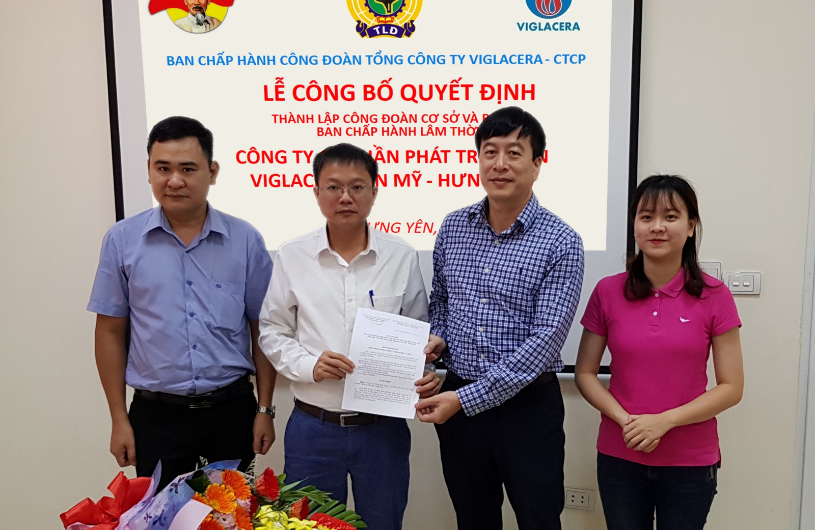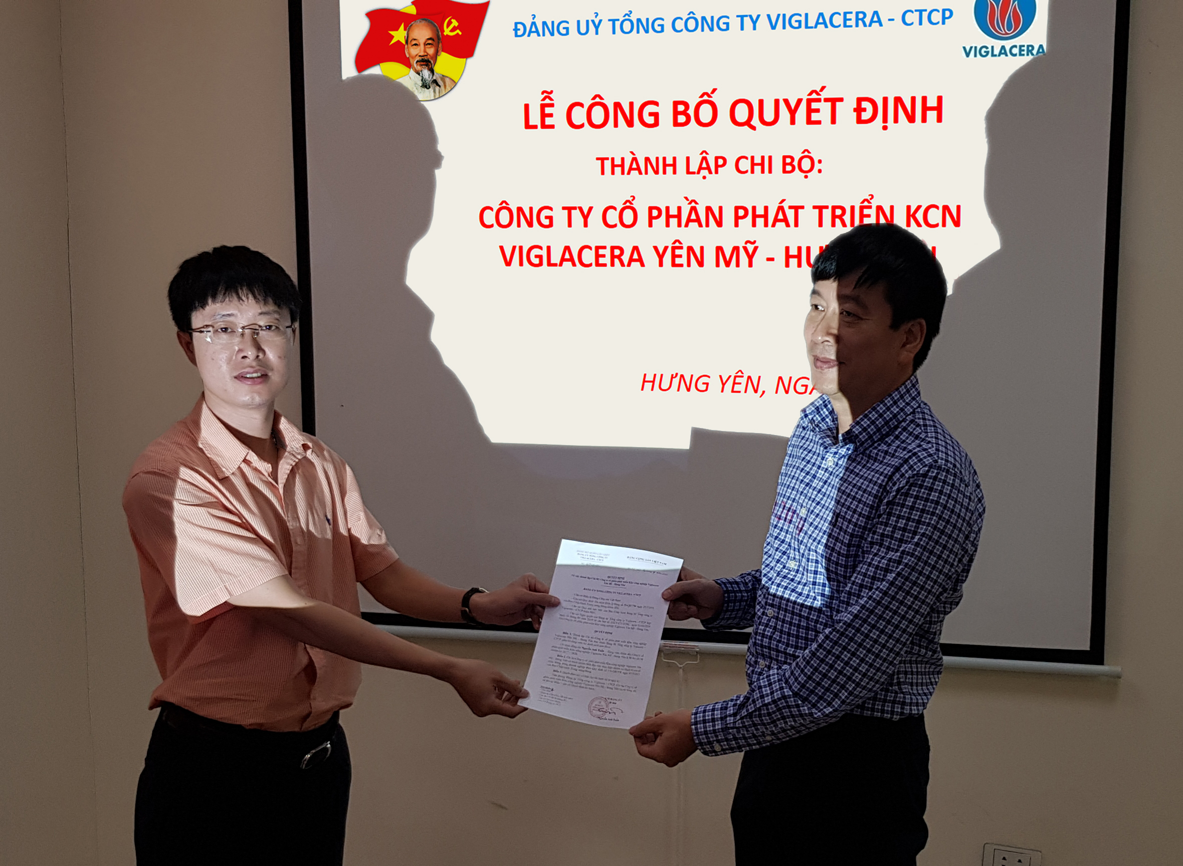 Thay mặt Ban Thường vụ Đảng ủy TCT Viglacera - CTCP, đồng chí Nguyễn Quý Tuấn - Uỷ viên Ban Thường vụ Đảng ủy, Chủ tịch Công đoàn TCty đã trao Quyết định thành lập Chi bộ Cty CP Phát triển KCN Viglacera Yên Mỹ - Hưng Yên trực thuộc Đảng bộ TCty Viglacera - CTCP, trong đó chỉ định đồng chí Nguyễn Anh Tuấn - Giám đốc Cty giữ chức Bí thư Chi bộ.