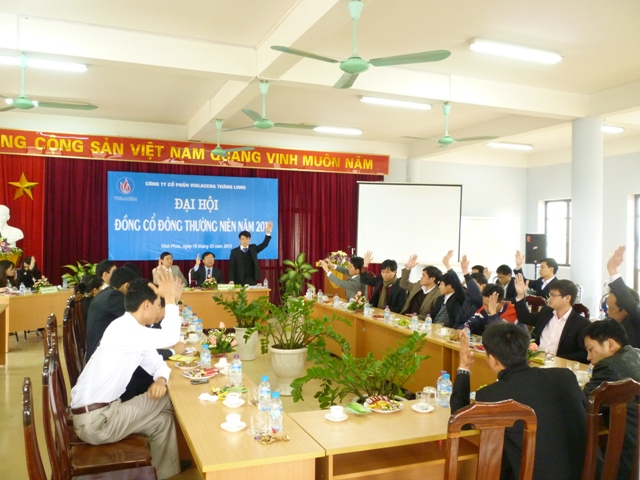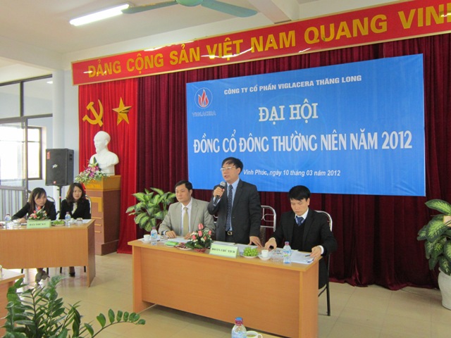 Ngày 10/3/2012, Công ty cổ phần Viglacera Thăng Long tổ chức đại hội đồng cổ đông thường niên năm 2012. Tổng số cổ đông tham dự Đại hội là 41 người, đại diện cho 5.262.473 cổ phần, đạt tỷ lệ: 75,288% cổ phần có quyền biểu quyết.