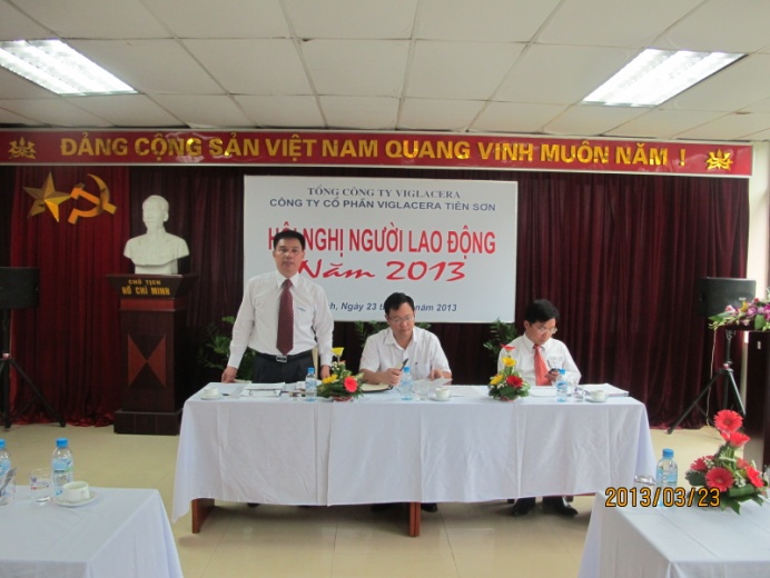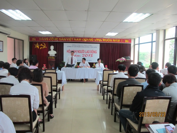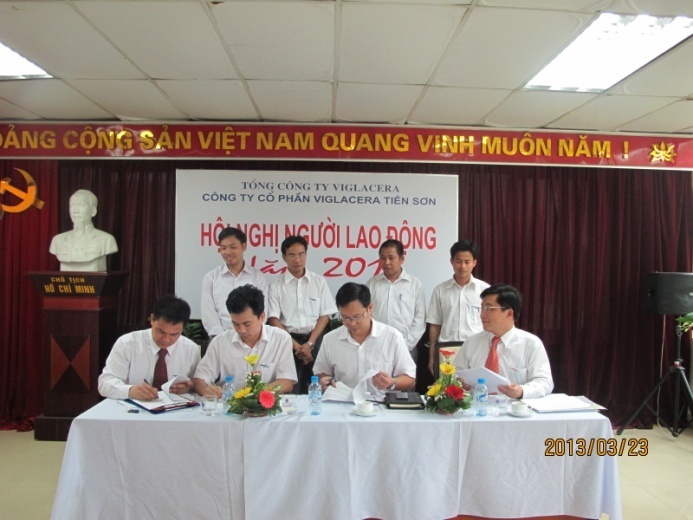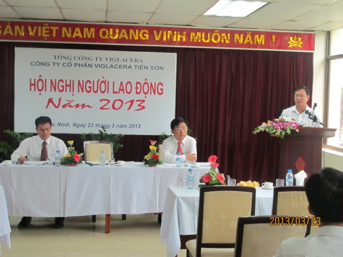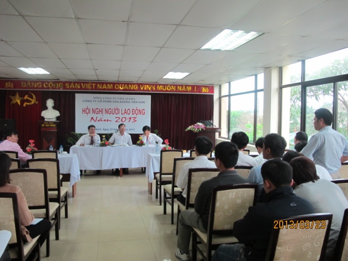 Ngày 23 tháng 3 năm 2013 tại KCN Tiên Sơn, huyện Tiên Du, Tỉnh Bắc Ninh Công ty CP Viglacera Tiên Sơn đã tổ chức Hội nghị người lao động năm 2013. Tham dự Đại Hội có các đồng chí trong chi ủy chi bộ, Ban lãnh đạo, BCH Công đoàn….và 51 đại biểu đại diện cho 490 CBCNV và chỉ đạo Hội nghị người lao động năm 2013 có đồng chí Nguyễn Quý Tuấn - UV HĐTV, Chủ tịch Công đoàn TCT.