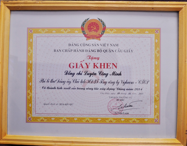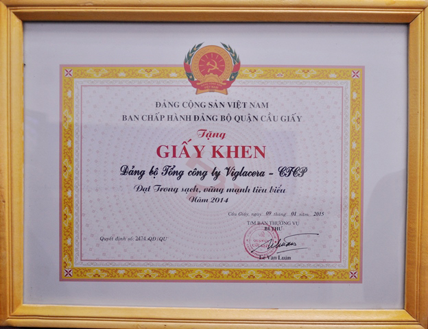 Căn cứ vào quyết định số 2474-QĐ/QU, ngày 09/01/2015, của Quận ủy Cầu Giấy về việc khen thưởng tổ chức cơ sở Đảng trong sạch vững mạnh tiêu biểu, Đảng viên có thành tích xuất sắc trong công tác Xây dựng Đảng năm 2014, Đảng bộ TCT Viglacera - CTCP vinh dự là 1 trong 7 Tổ chức cơ sở Đảng trong sạch vững mạnh tiêu biểu thuộc Quận. Bên cạnh đó, Quận ủy Cầu Giấy cũng tặng giấy khen cho Chủ tịch HĐQT Luyện Công Minh – Cá nhân có thành tích xuất sắc trong công tác xây dựng Đảng năm 2014.