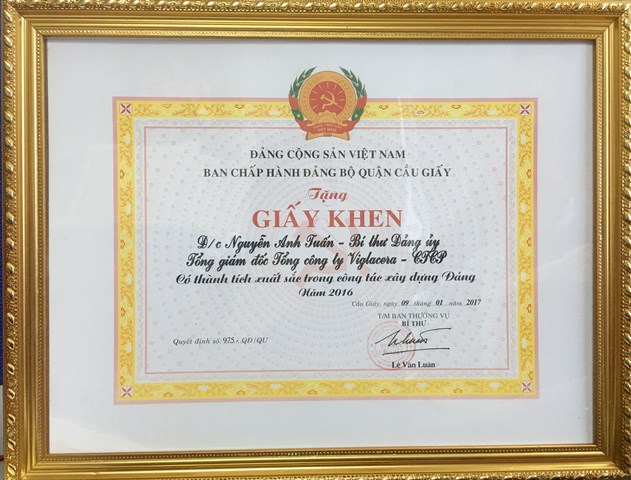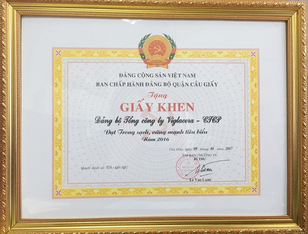 Căn cứ vào quyết định số 974-QĐ/QU, ngày 09/01/2017, của Quận ủy Cầu Giấy về việc khen thưởng tổ chức cơ sở Đảng trong sạch vững mạnh tiêu biểu, Đảng viên có thành tích xuất sắc trong công tác Xây dựng Đảng năm 2016, Đảng bộ TCT Viglacera - CTCP vinh dự là 1 trong 5 Tổ chức cơ sở Đảng trong sạch vững mạnh tiêu biểu trực thuộc Đảng bộ quận Cầu Giấy. Bên cạnh đó, Quận ủy Cầu Giấy cũng tặng giấy khen cho Bí thư Đảng ủy, Tổng giám đốc TCT Nguyễn Anh Tuấn – Cá nhân có thành tích xuất sắc trong công tác xây dựng Đảng năm 2016.