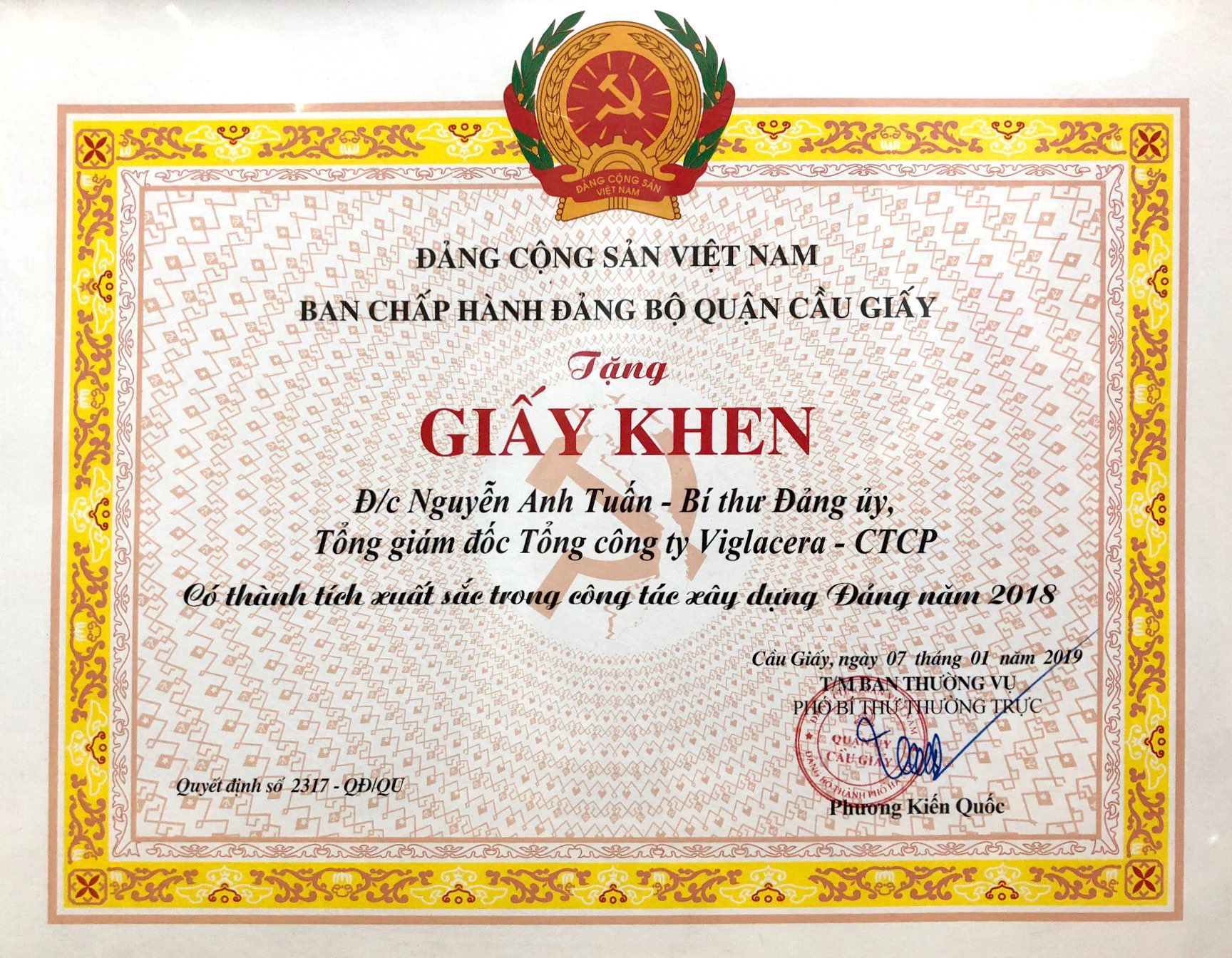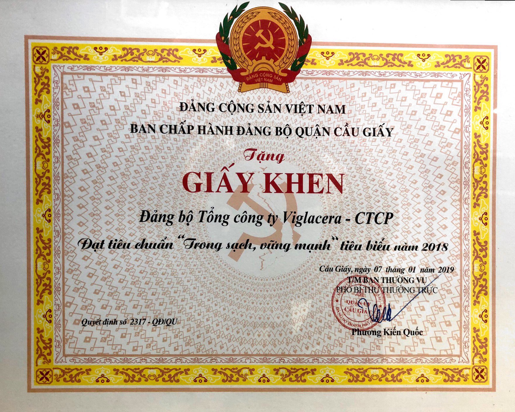 Căn cứ vào quyết định số 2317-QĐ/QU, ngày 07/01/2019, của Quận ủy Cầu Giấy về việc khen thưởng tổ chức cơ sở Đảng trong sạch vững mạnh tiêu biểu, Đảng viên có thành tích xuất sắc trong công tác Xây dựng Đảng năm 2018, Đảng bộ Tổng công ty Viglacera - CTCP vinh dự là 1 trong 8 tổ chức cơ sở Đảng trong sạch vững mạnh tiêu biểu thuộc Quận. Bên cạnh đó, Quận ủy Cầu Giấy cũng tặng giấy khen cho Tổng giám đốc TCT Nguyễn Anh Tuấn – Cá nhân có thành tích xuất sắc trong công tác xây dựng Đảng năm 2018.