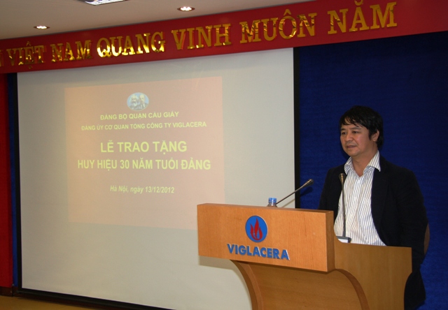 Đồng chí Luyện Công Minh, Phó bí thư Đảng uỷ, CT HĐTV TCT Viglacera phát biểu tại lễ trao tặng huy hiệu 30 năm tuổi Đảng và kết nạp Đảng viên mới.
