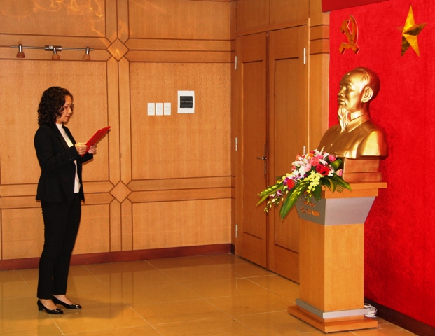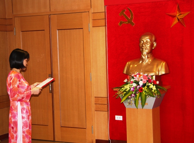 Đảng viên mới Lê Ngân Bình tuyên thệ trước Đảng kỳ, Quốc kỳ và chân dung chủ tịch Hồ Chí Minh