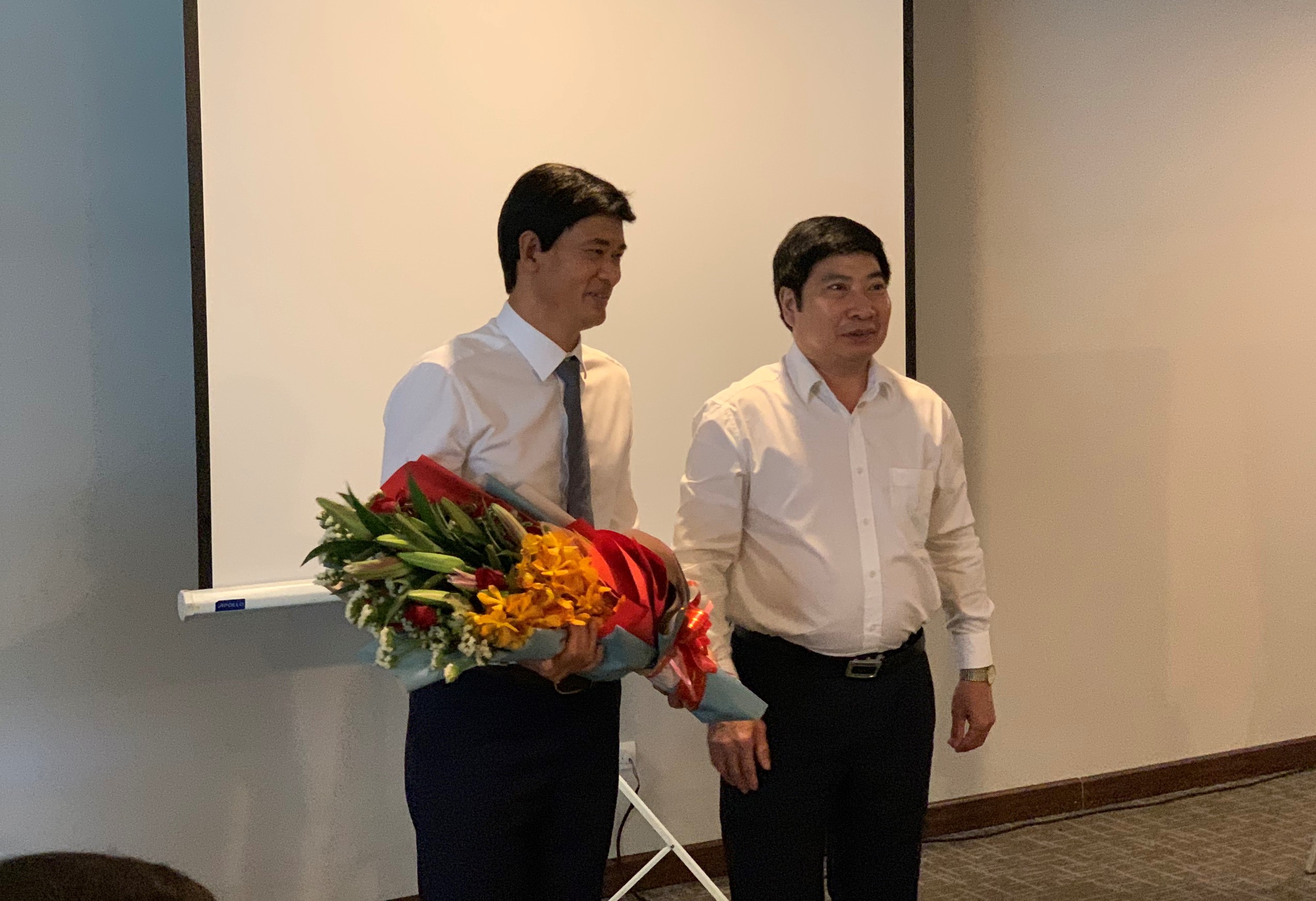 Đồng chí Phạm Xuân Hải, Phó CT CĐXD tặng hoa chúc mừng đồng chí Nguyễn Hữu Mão.