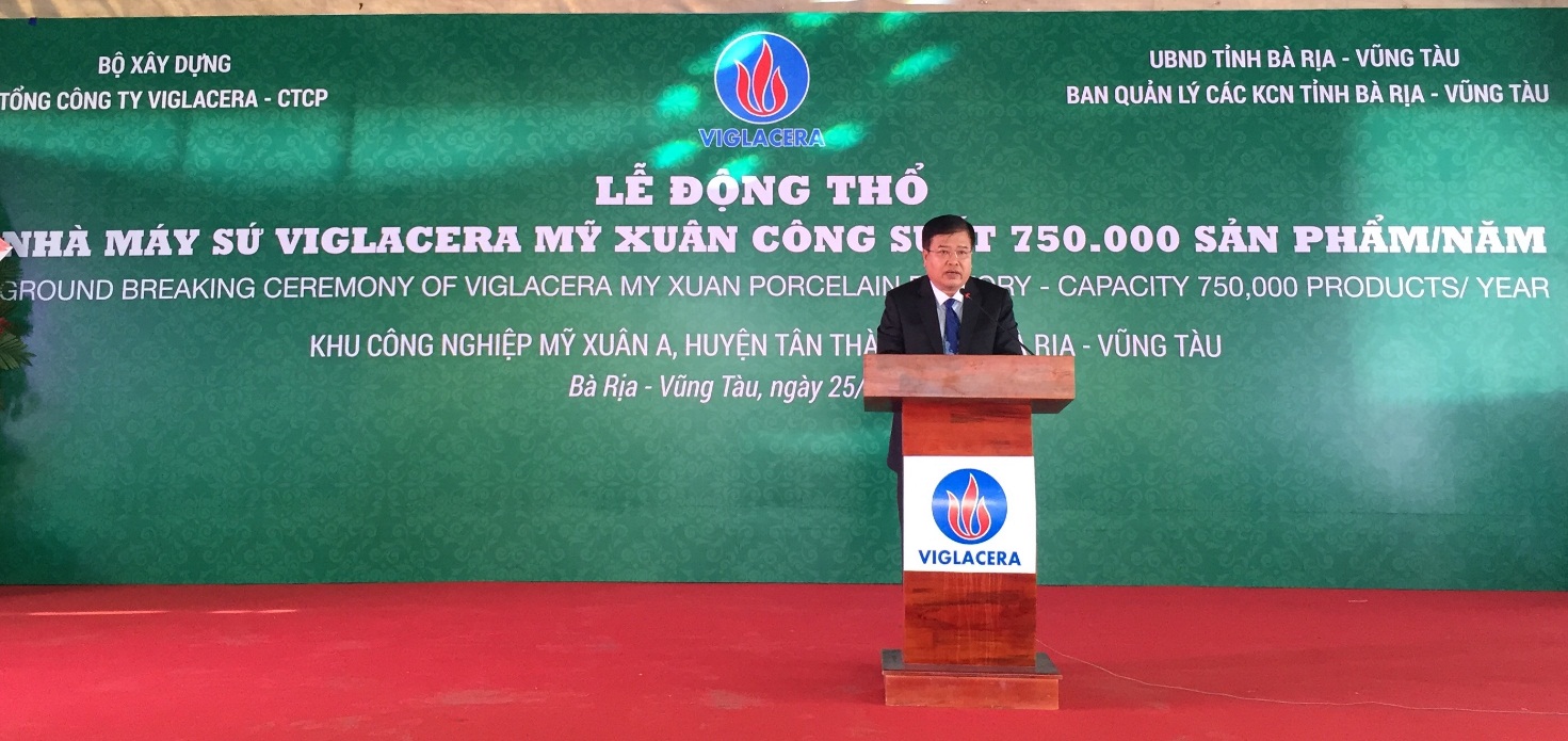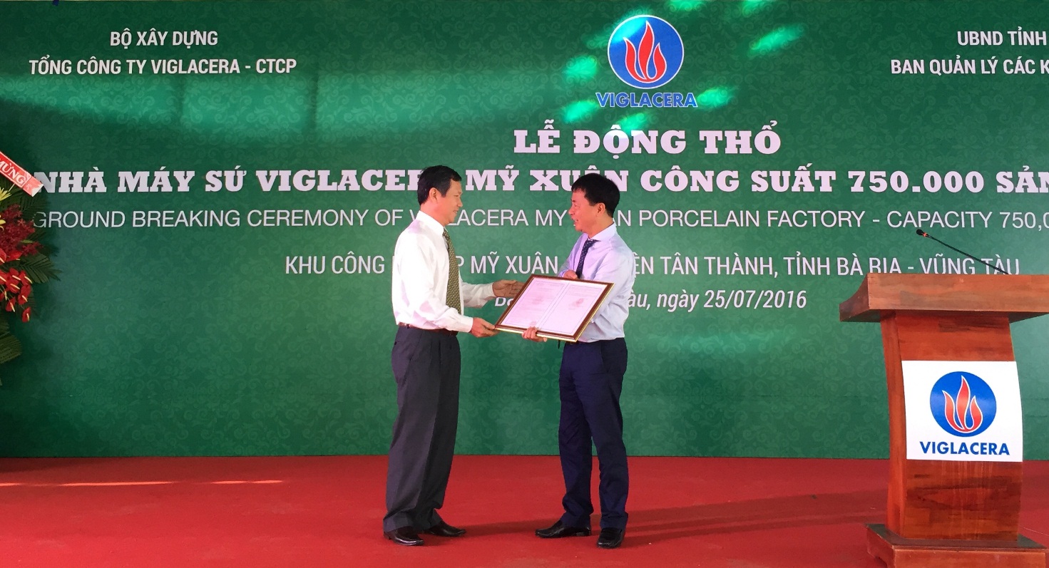 Nhân dịp kỷ niệm 42 năm ngày thành lập 25/7/1974 – 25/7/2016, Tổng công ty Viglacera – CTCP đã long trọng tổ chức Lễ Động thổ nhà máy Sứ Viglacera Mỹ Xuân công suất 750.000 sản phẩm/ năm tại KCN Mỹ Xuân A, huyện Tân Thành, tỉnh Bà Rịa -Vũng Tàu. Đây là một dự án lớn nhằm hiện thức hóa mũi nhọn phát triển mở rộng của Viglacera tại thị trường phía Nam.