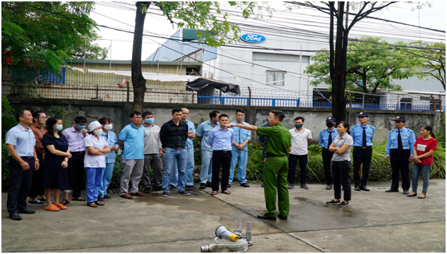 Với tình huống giả định: Có đám cháy xảy ra tại Phân xưởng gia công cơ khí. Phát hiện cháy, bảo vệ Công ty đã báo động toàn Công ty, Giám đốc Công ty huy động Đội PCCC cơ sở gồm 30 người triển khai phương án chữa cháy, cứu người, cứu tài sản. Đồng thời điện thoại báo cháy cho lực lượng Cảnh sát PCCC&CNCH về diễn biến vụ cháy và số lượng người mắc kẹt trong đám cháy.