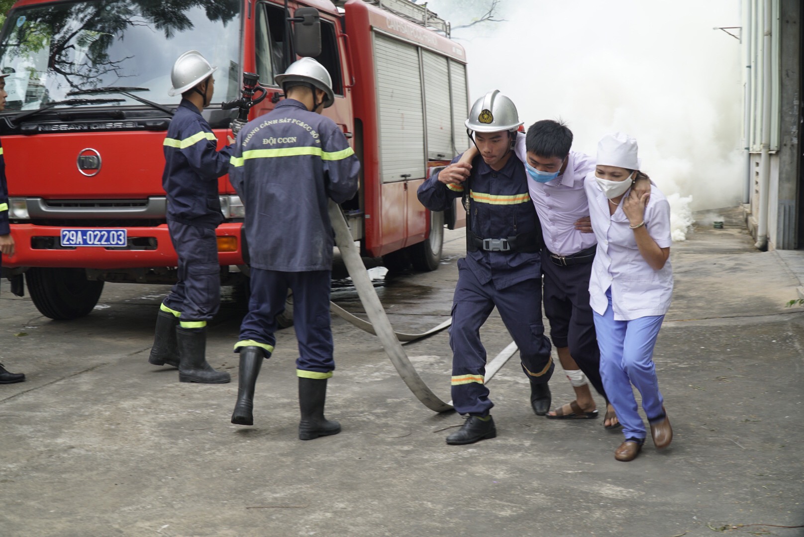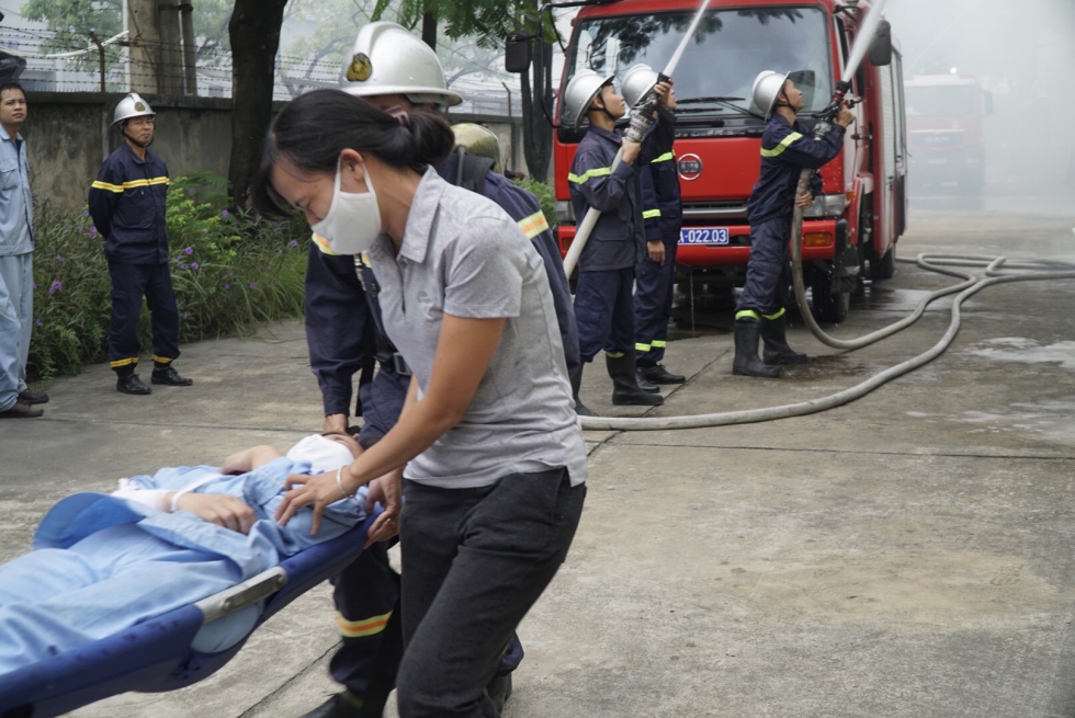 Nhận tin báo Phòng Cảnh sát PCCC&CNCH đã điều động 02 xe chữa cháy cùng 15 CBCS đến hiện trường vụ cháy, tiến hành trinh sát theo tình huống giả định cứu 05 công nhân mắc kẹt ra khu vực an toàn, triển khai đội hình chữa cháy, chống cháy lan và cứu tài sản. Với các động tác thành thạo, cùng kỹ thuật, chiến thuật chính xác, sự phối hợp chỉ huy và chữa cháy, CNCH nhịp nhàng của 2 đơn vị, sau 15 phút người và tài sản được di chuyển đến nơi an toàn, đám cháy được dập tắt hoàn toàn.