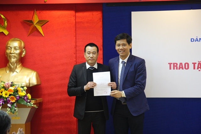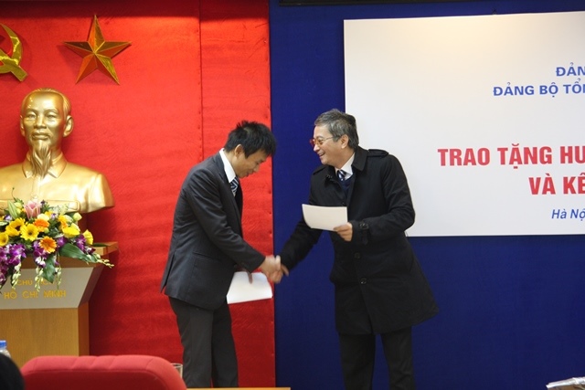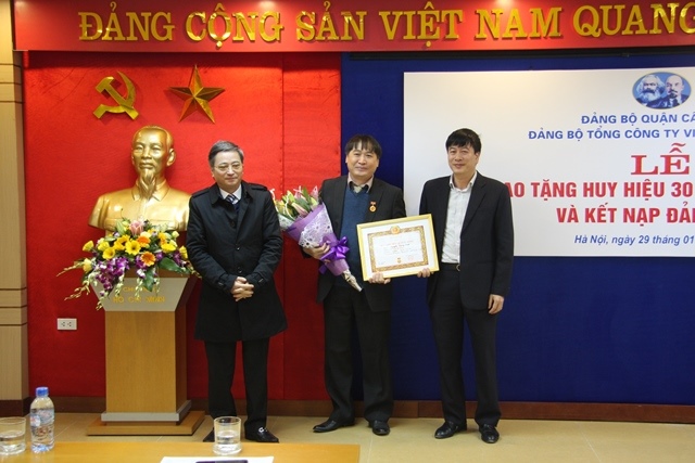 Đ/c Nguyễn Quý Tuấn – Ủy viên Ban Thường vụ TCT , Chủ tịch Công đoàn TCT và đ/c Nguyễn Minh Tuấn – Uỷ viên BCH Đảng uỷ TCT Bí thư Chi bộ Ban Thương mại, Phó Tổng giám đốc TCT trao tặng bằng khen và gắn Huy hiệu 30 năm tuổi Đảng cho đồng chí Nguyễn Quang Vinh