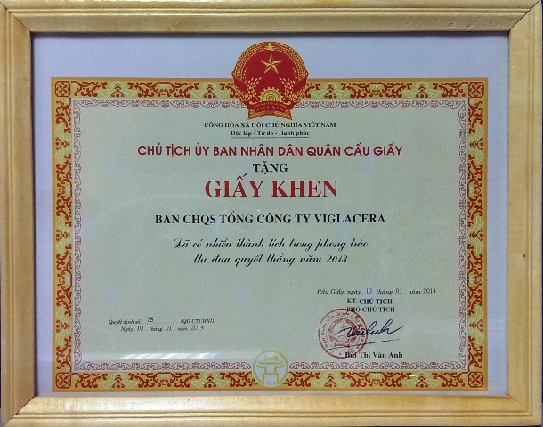 UBND Quận Cầu Giấy tặng giấy khen về thành tích xuất sắc trong phong trào thi đua quyết thắng năm 2013 cho Ban Chỉ huy Quân sự TCT Viglacera