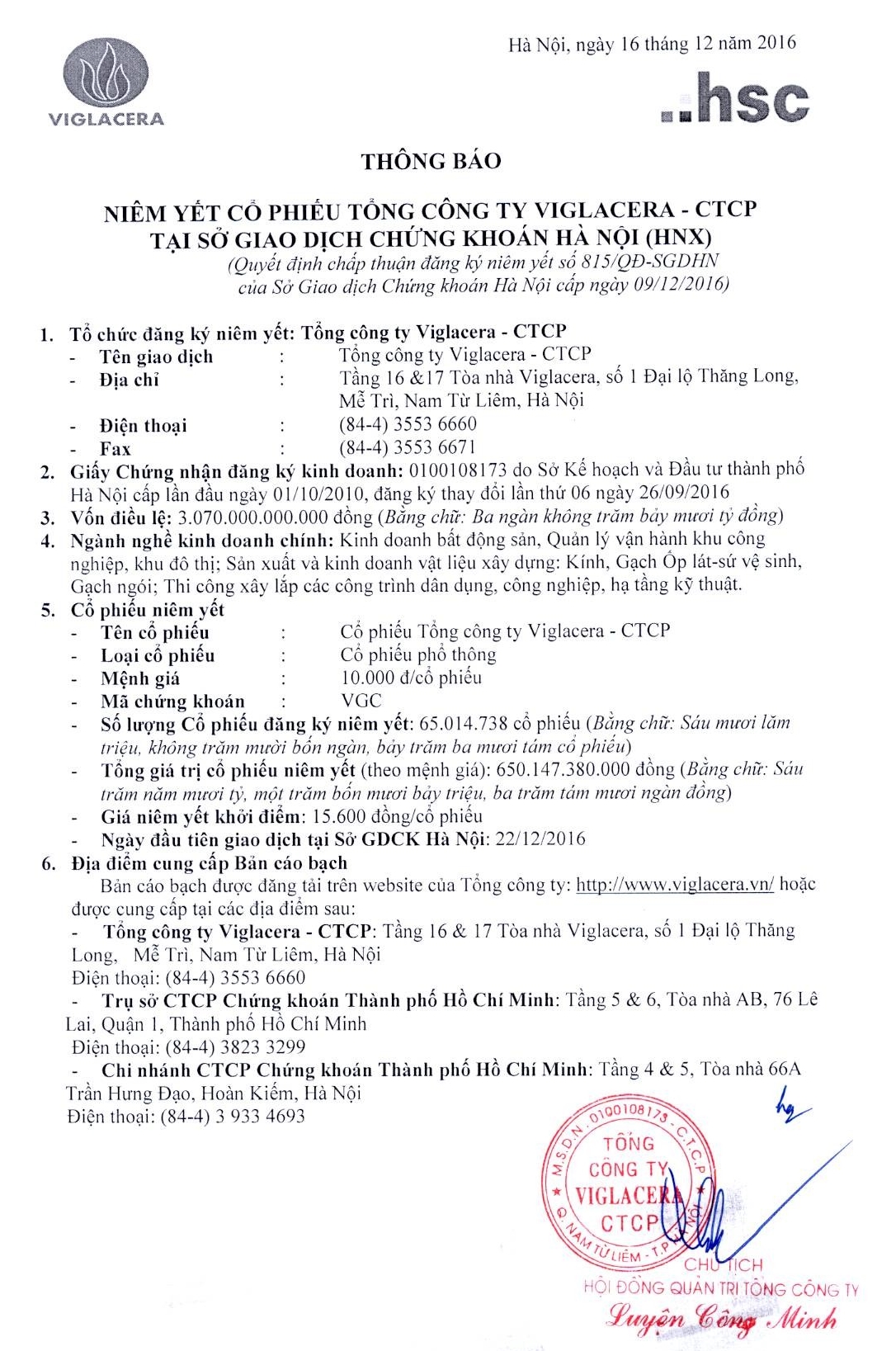Thông báo niêm yết cổ phiếu Tổng công ty Viglacera - CTCP ngày 22/12/2016 tại Sở Giao dịch Chứng khoán Hà Nội