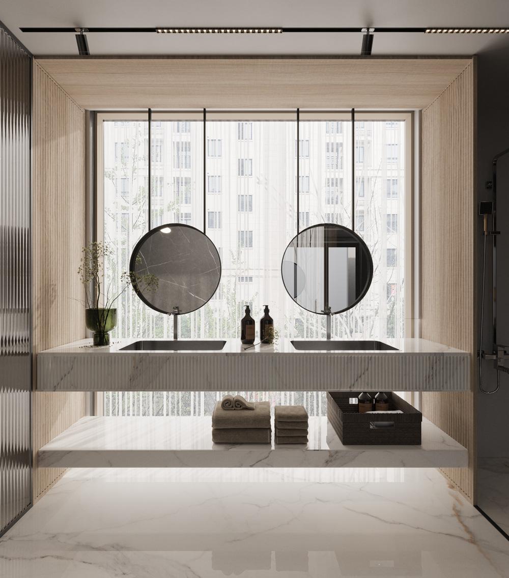 Trong phòng tắm, lavabo và mặt bàn đá không chỉ tiện dụng mà còn thể hiện gu thẩm mỹ tinh tế.