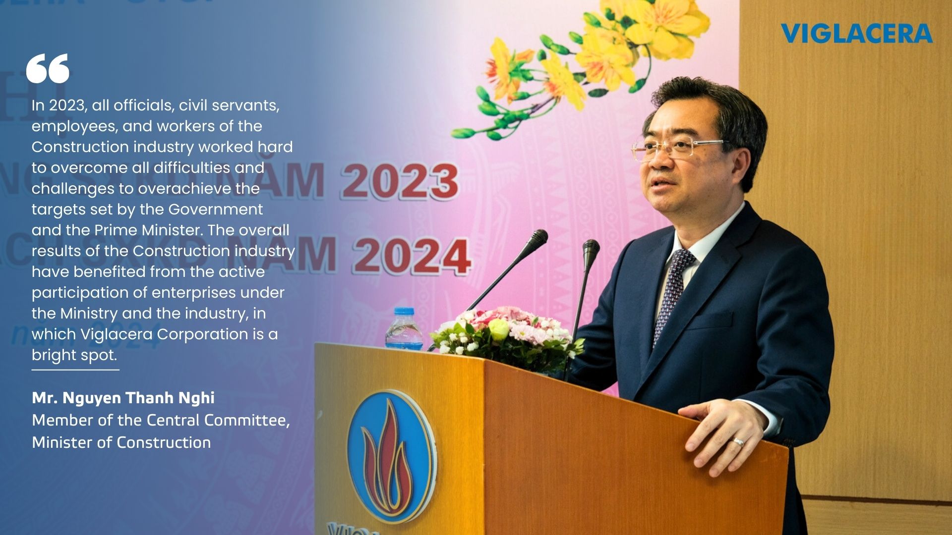 Minister of Construction Nguyen Thanh Nghi acknowledged, highly appreciated, and praised the important results that Viglacera Corporation achieved in 2023. He said: "In 2023, all officials, civil servants, employees, and workers of the Construction industry have worked hard to overcome all difficulties and challenges to overachieve the targets set by the Government and the Prime Minister. The overall results of the Construction industry have benefited from the active participation of enterprises under the Ministry and the industry, in which Viglacera Corporation is a bright spot."