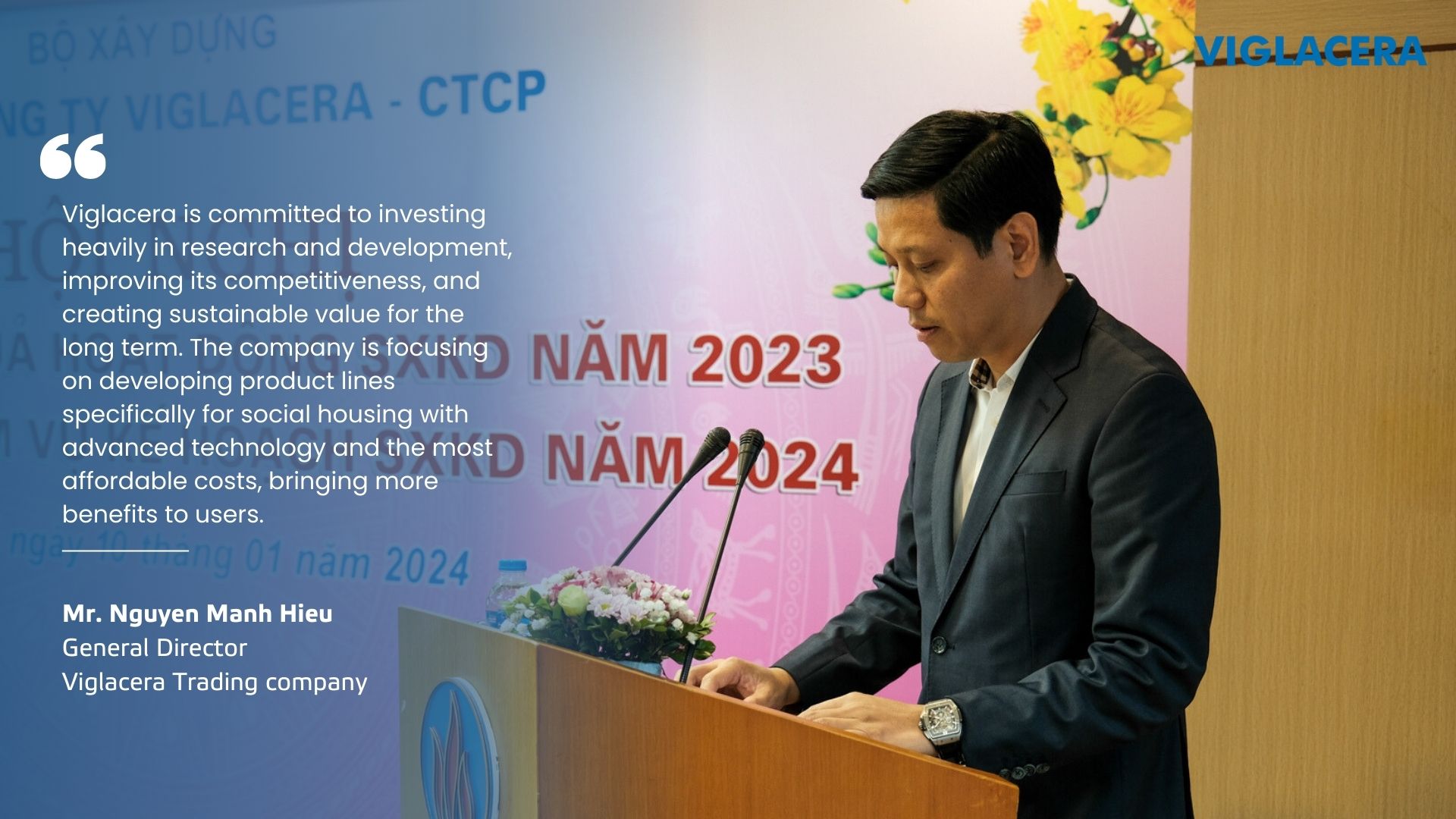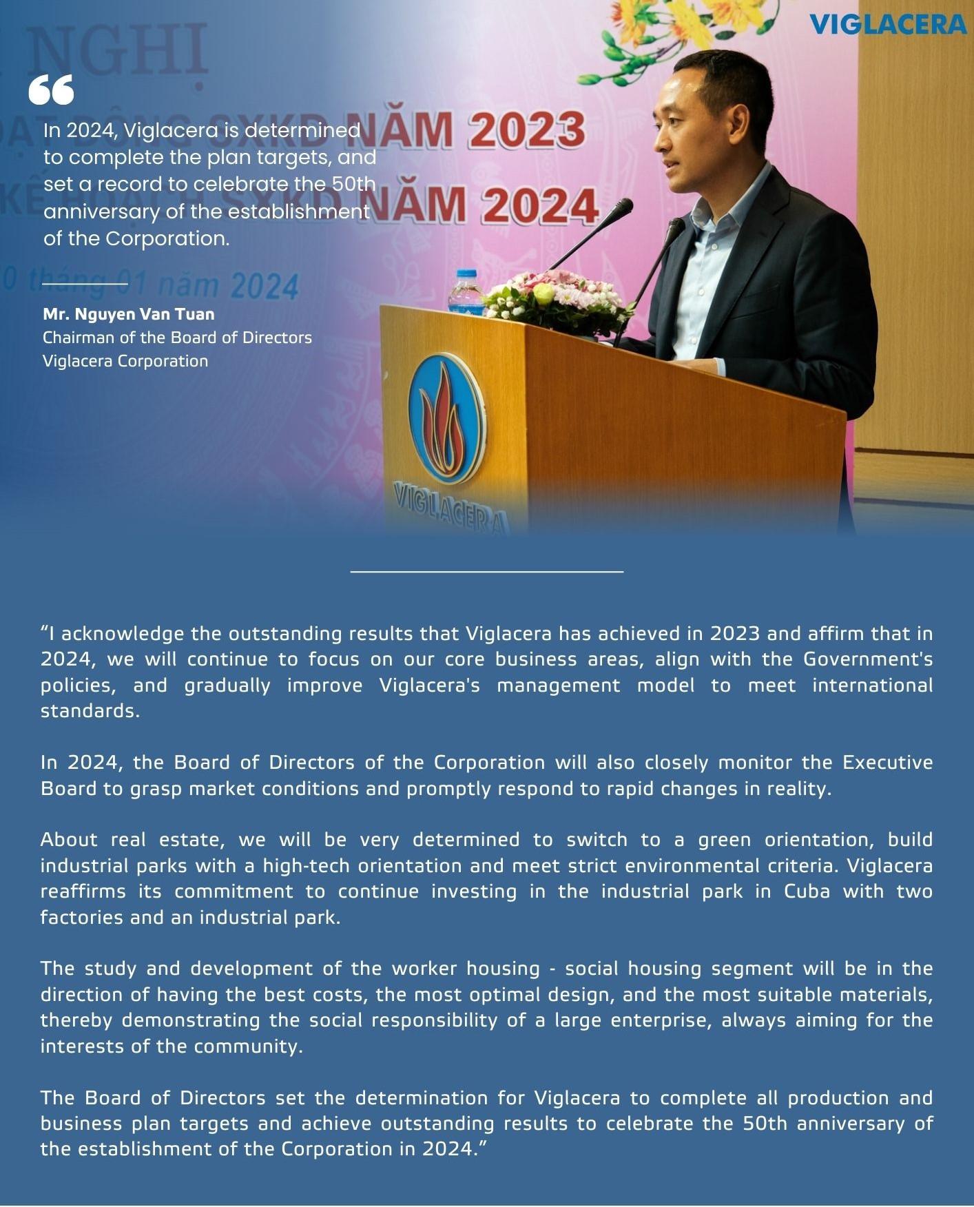 It is known that also in 2023, Viglacera has focused resources to effectively implement many activities such as: Launching the largest sintered stone sheet in Vietnam; Launching the first square meters of Ultra Clear Glass in Vietnam; Strongly developing industrial park real estate; Boosting investment in worker housing and social housing; Boosting the development of tourism and resort real estate, opening up a new business direction for the Corporation; Boosting exports to European and American markets with the goal of achieving 68 million USD in total revenue for the Corporation in 2024.