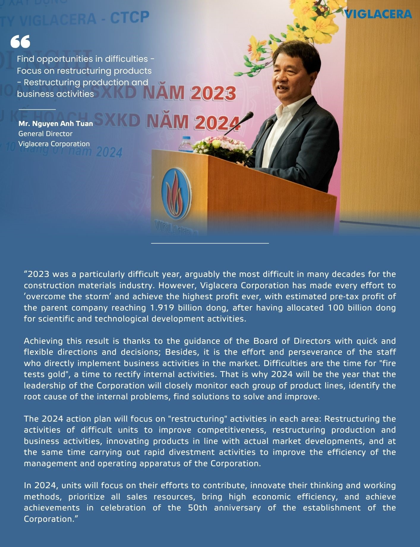 At the conference on the results of production and business activities in 2023 and the implementation of the production and business plan for 2024, Mr. Nguyen Anh Tuan, Deputy General Director of Viglacera Corporation, reported to the Minister of Construction and the entire conference: "In 2023, with the close guidance of the leadership of the Ministry of Construction, the decisive and flexible management of the Board of Directors, the leadership, and the unity, solidarity, and efforts of the staff, Viglacera Corporation has exceeded the main targets, profits before tax have been assigned by the General Assembly of Shareholders. The parent company always plays a good role in leading and guiding in directing and managing. In 2023, the estimated pre-tax profit of the entire consolidated corporation was VND1,593 billion, achieving 132% of the plan approved by the General Assembly of Shareholders; the estimated pre-tax profit of the parent company was VND1,919 billion, achieving 147% of the plan approved by the General Assembly of Shareholders."